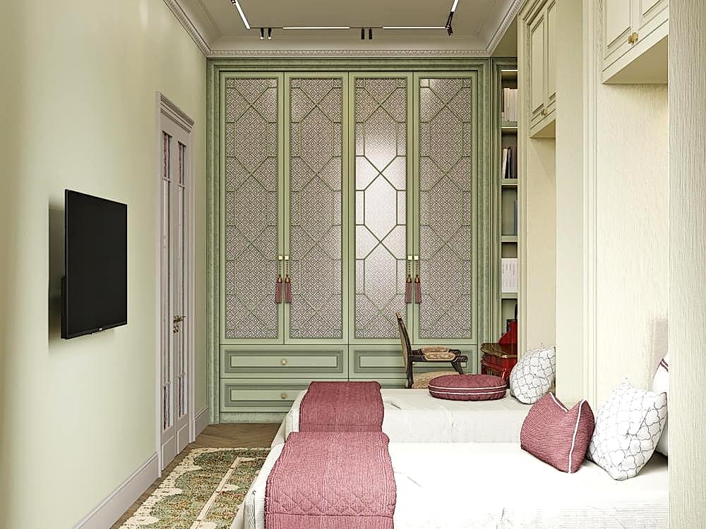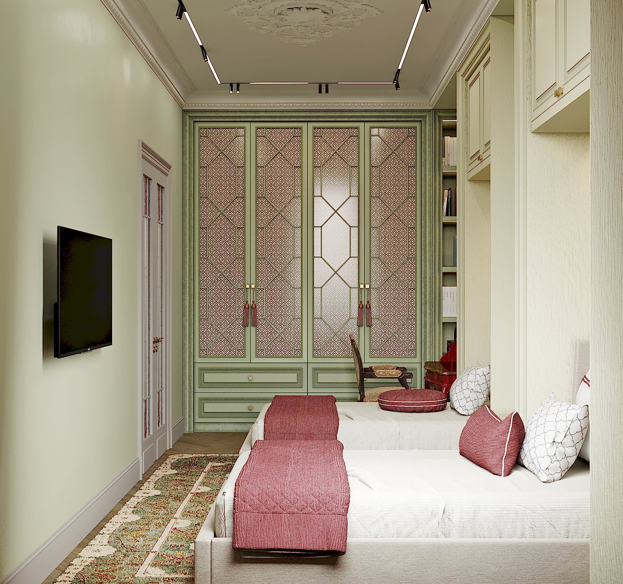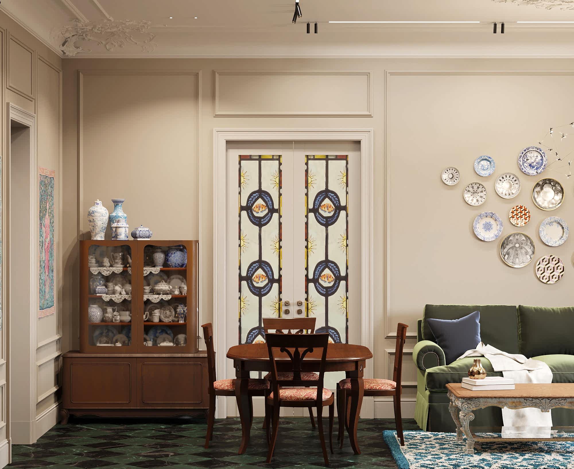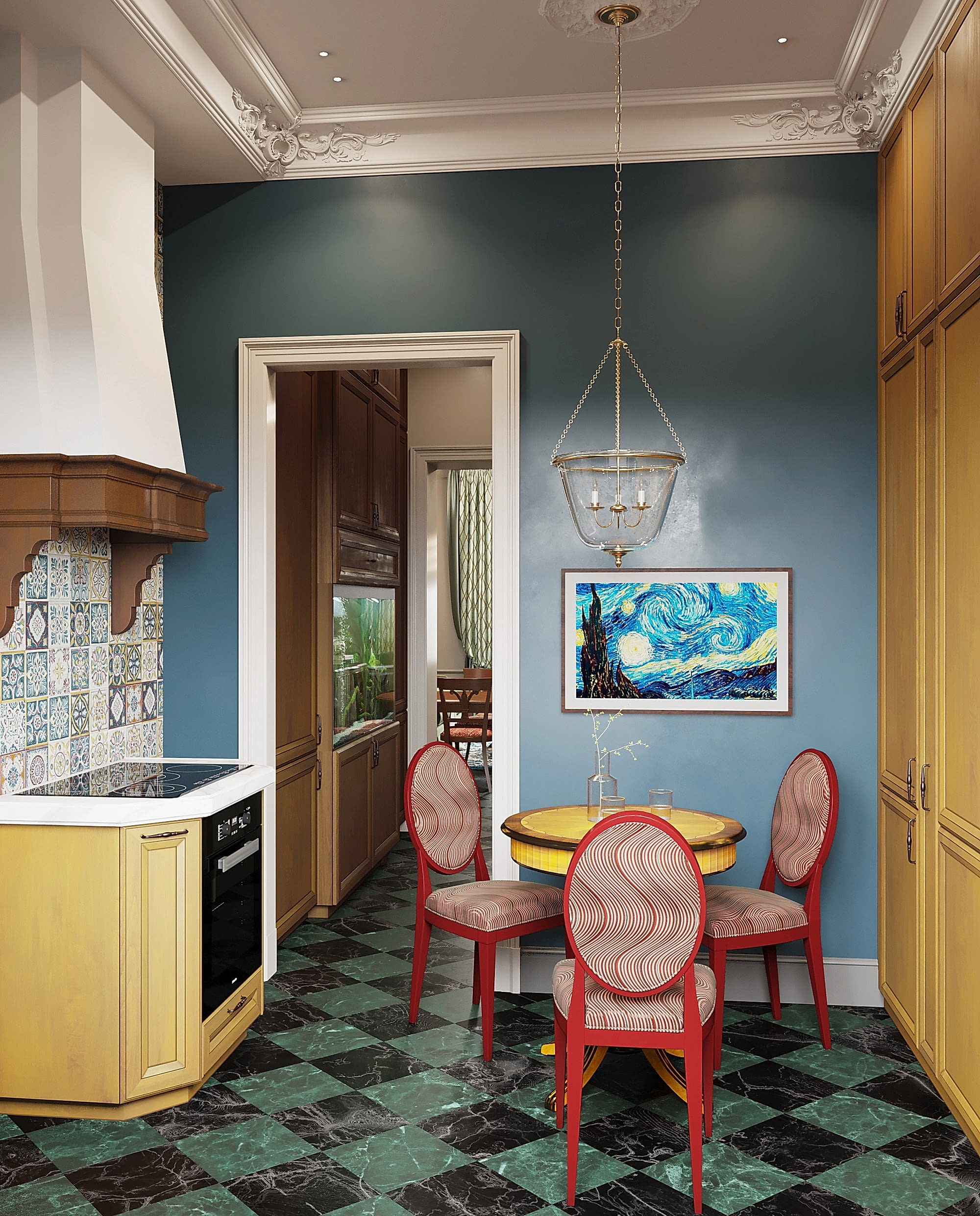 Квартира находится в историческом центре Астаны, обладающая необходимым функционалом для комфортного проживания четырех человек. Жилое пространство разделено на две спальни и имеет общую гостевую зону с небольшой кухней. Интерьер квартиры оформлен в эклектичном стиле, его образ строится на изысканном сочетании разных цветов и фактур, насыщенных деталей и форм. Придерживаться единой "сюжетной линии" в таком многослойном пространстве помогают лазурные, терракотовые, оттенки охры и цвет зеленого малахита. Используемые в отделке стен, обивке мебели, ковровом покрытии и текстиле. На первый взгляд, стилистически далекие друг от друга детали успешно соседствуют в интерьере данной Pin-Up не скрывая своей любви к "избыточному" дизайну и цвету.