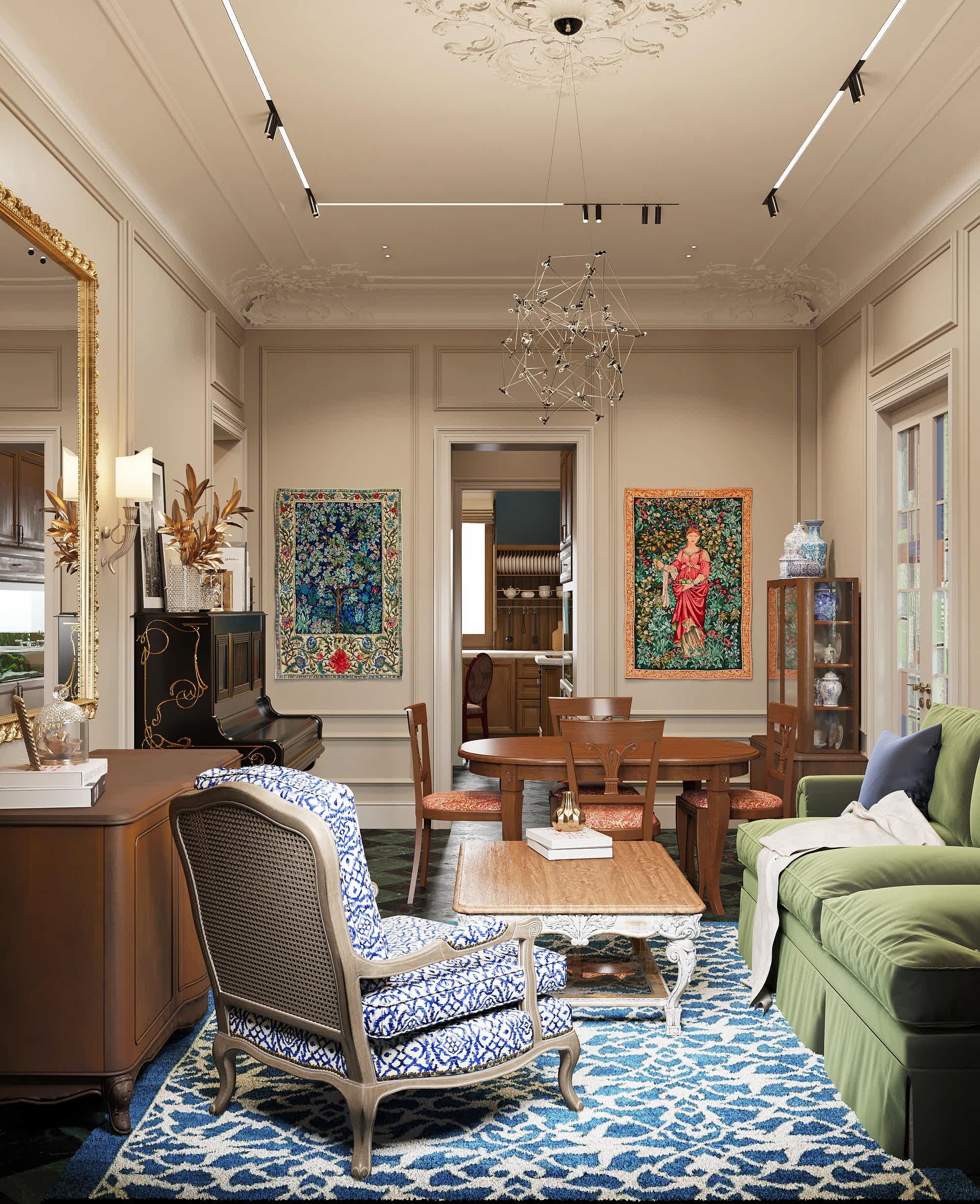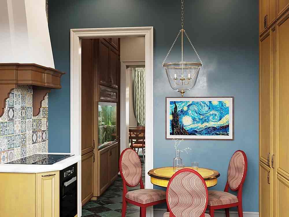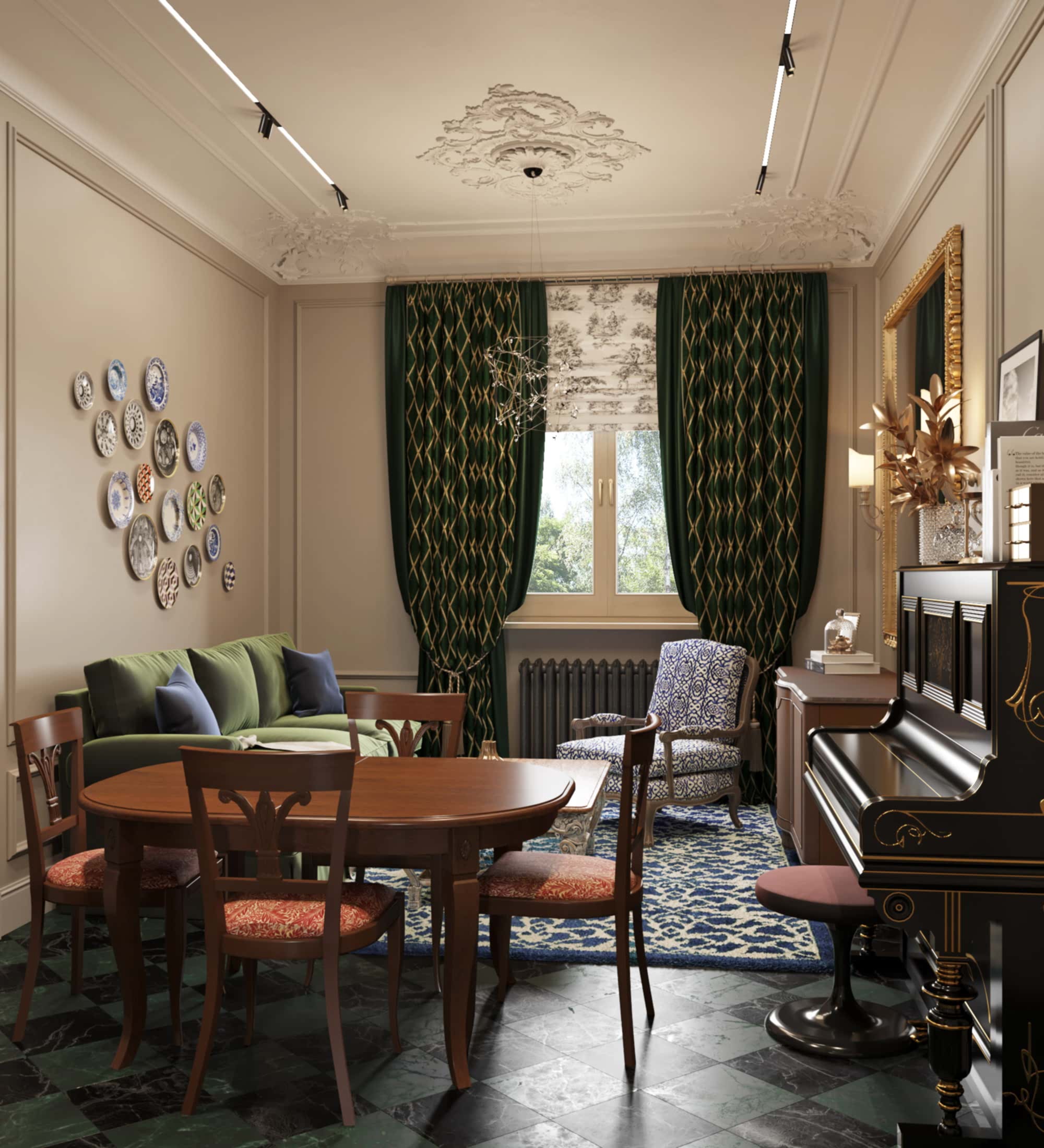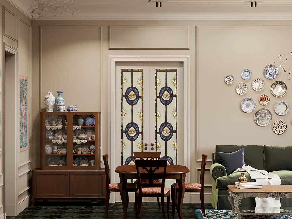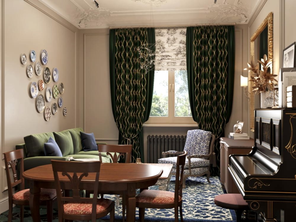 Квартира находится в историческом центре Астаны, обладающая необходимым функционалом для комфортного проживания четырех человек. Жилое пространство разделено на две спальни и имеет общую гостевую зону с небольшой кухней. Интерьер квартиры оформлен в эклектичном стиле, его образ строится на изысканном сочетании разных цветов и фактур, насыщенных деталей и форм. Придерживаться единой "сюжетной линии" в таком многослойном пространстве помогают лазурные, терракотовые, оттенки охры и цвет зеленого малахита. Используемые в отделке стен, обивке мебели, ковровом покрытии и текстиле. На первый взгляд, стилистически далекие друг от друга детали успешно соседствуют в интерьере данной Pin-Up не скрывая своей любви к "избыточному" дизайну и цвету.