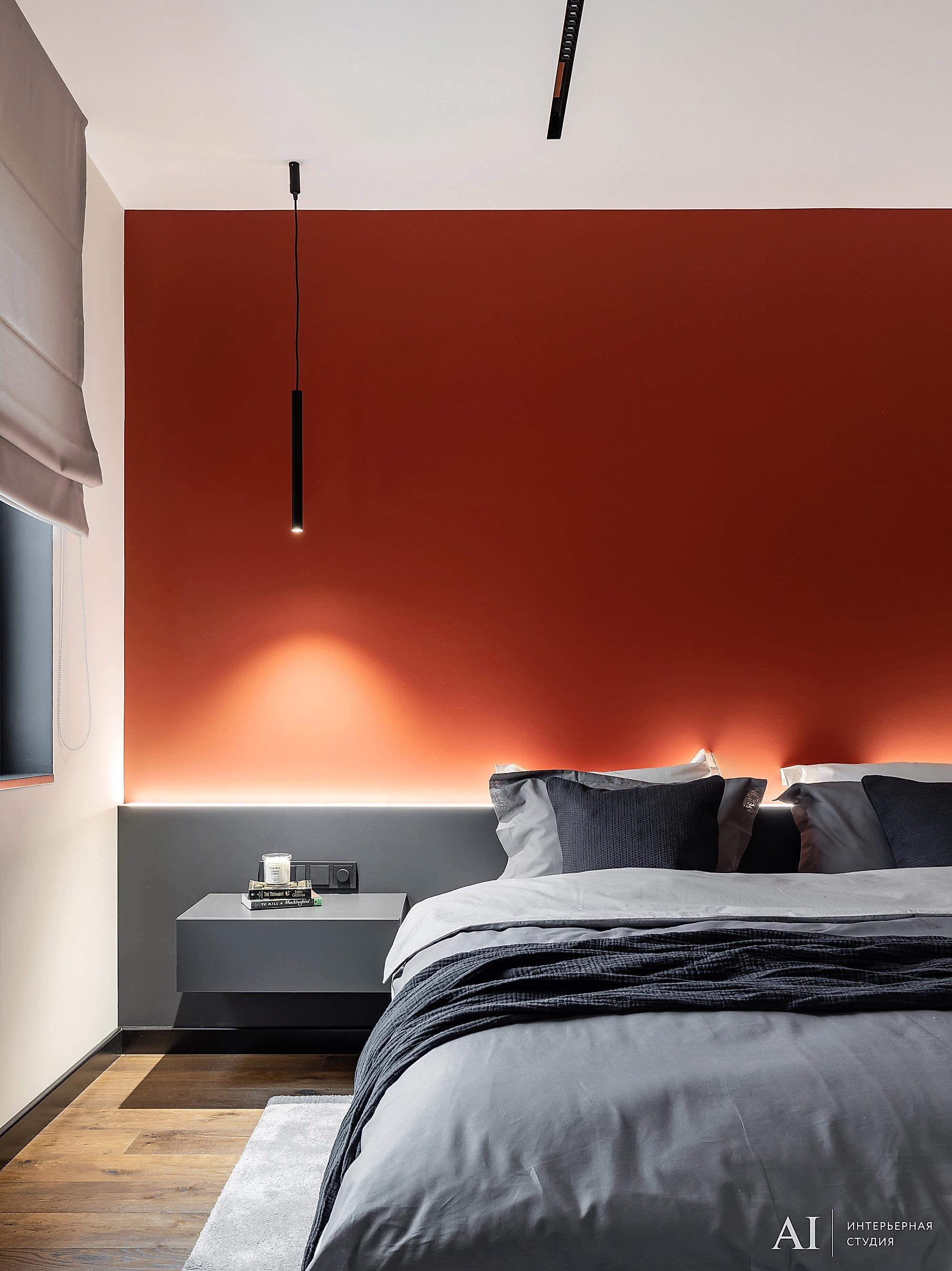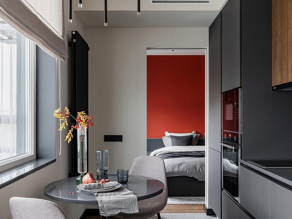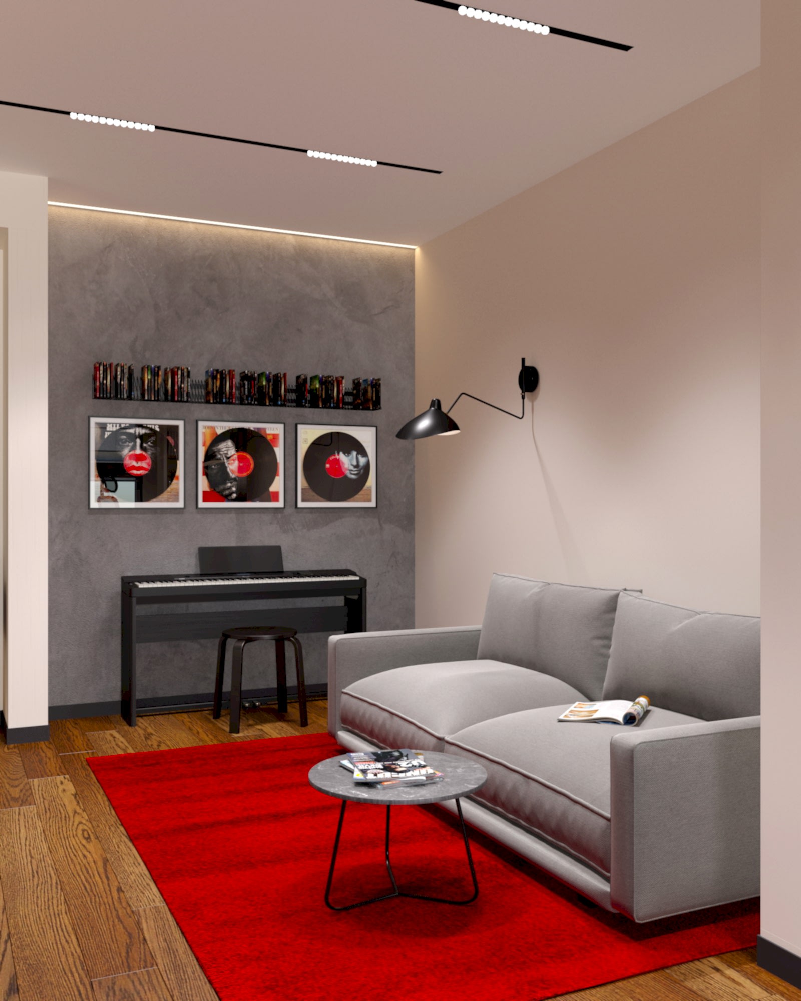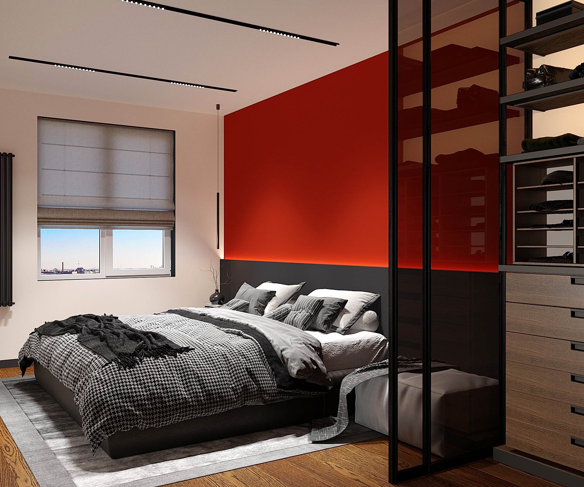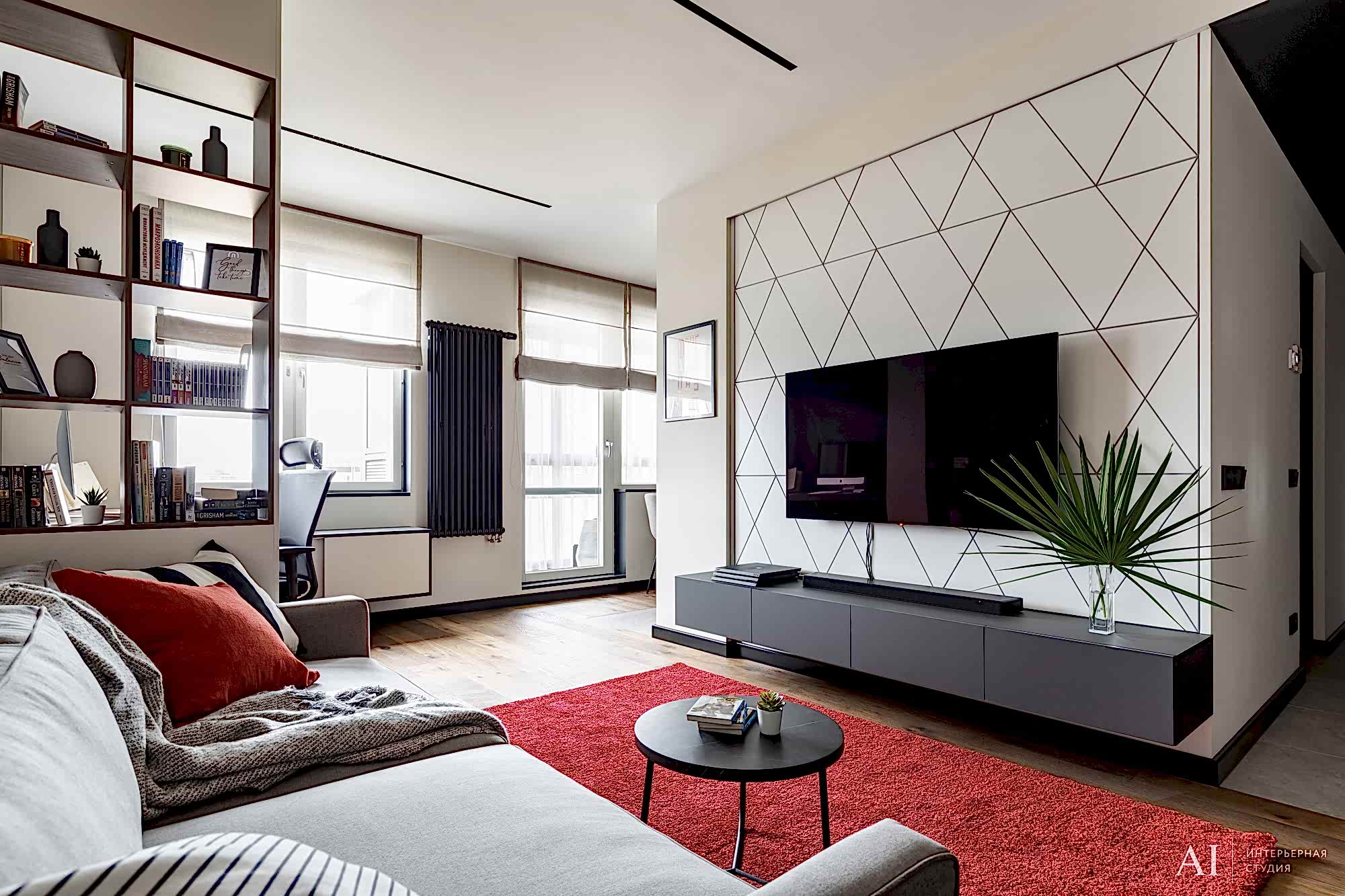 Pin-Up мужской интерьер с применением натуральныхматериалов, наполненный четкими линиями, большим количеством света и минимумом декора. Главным акцентом интерьера стал сочный красный цвет, который насытил пространство яркими красками и подчеркнул Рыскулова, 52 геометрию форм.