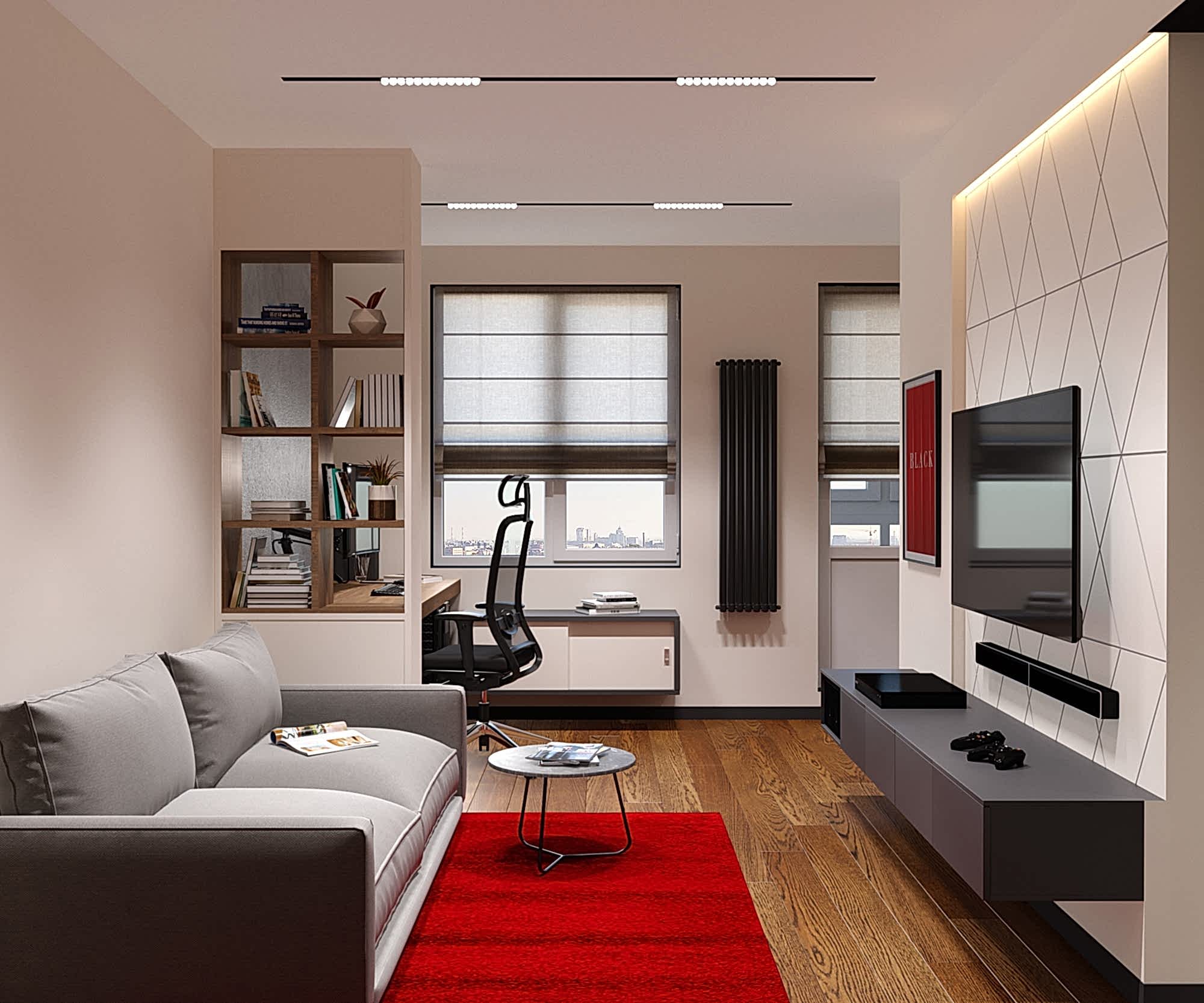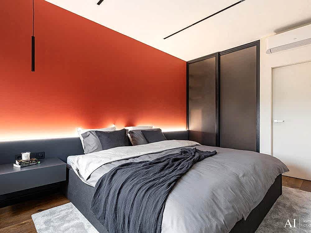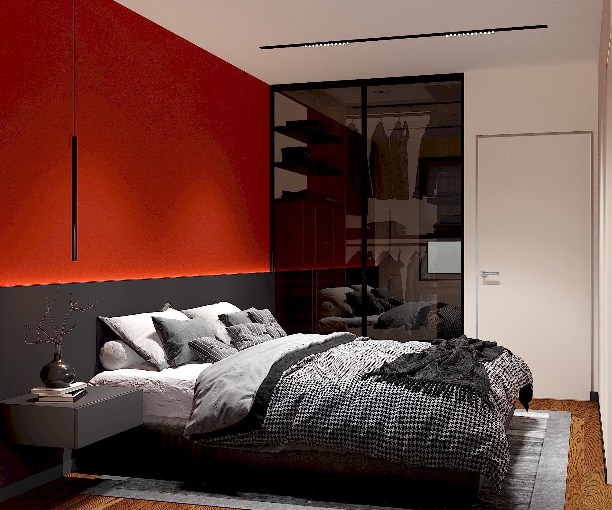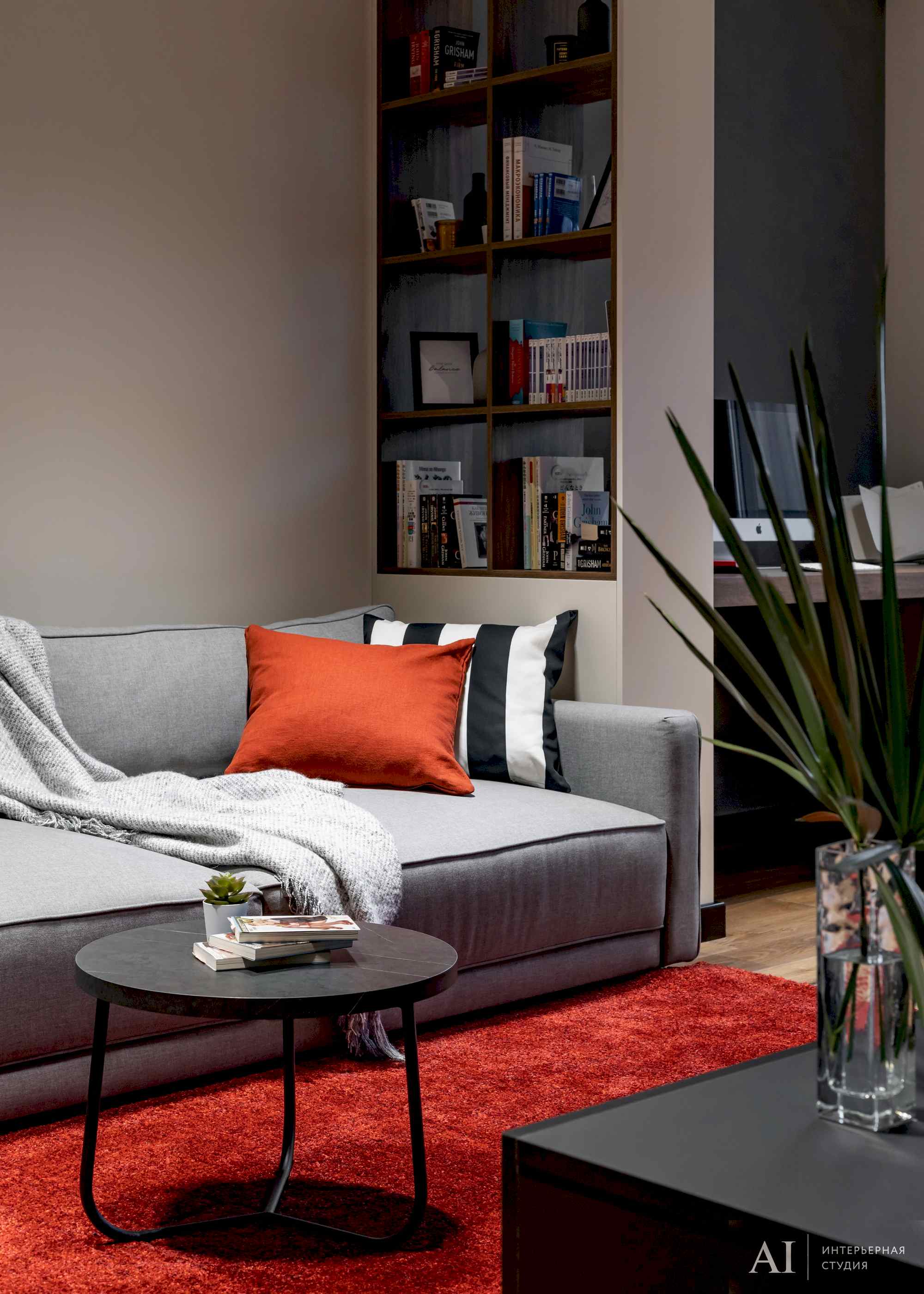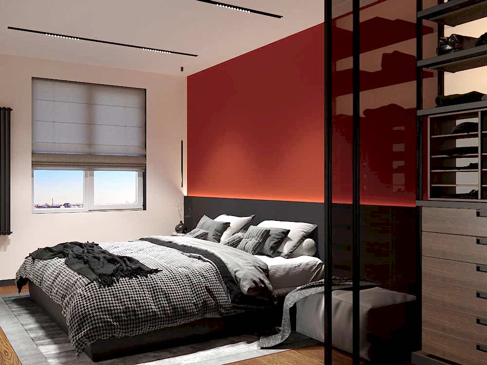 Pin-Up мужской интерьер с применением натуральныхматериалов, наполненный четкими линиями, большим количеством света и минимумом декора. Главным акцентом интерьера стал сочный красный цвет, который насытил пространство яркими красками и подчеркнул Рыскулова, 52 геометрию форм.