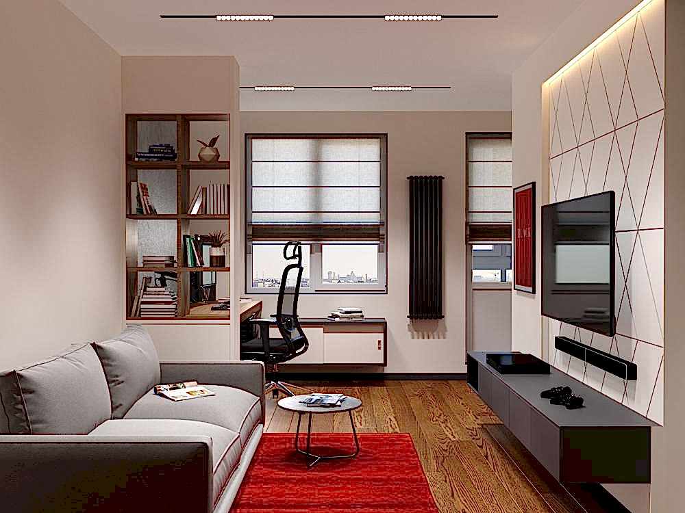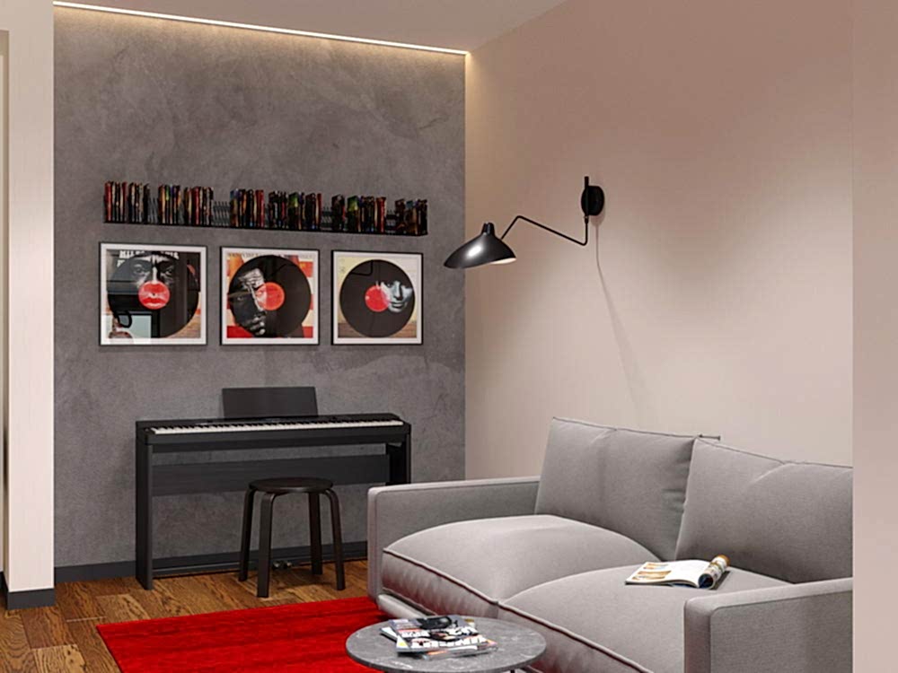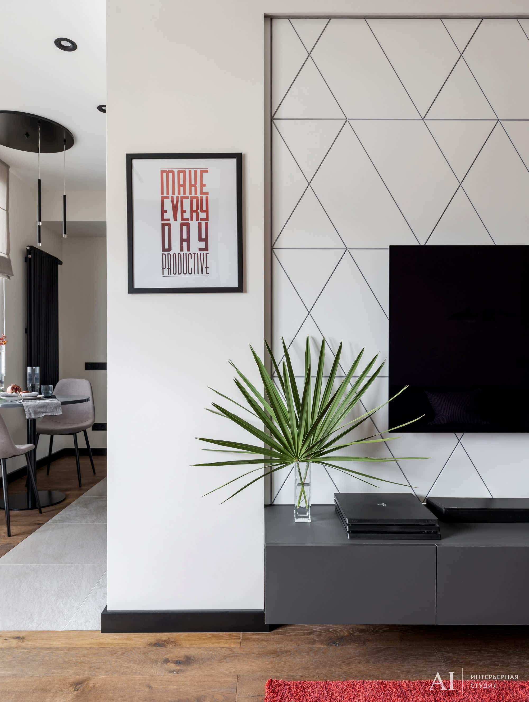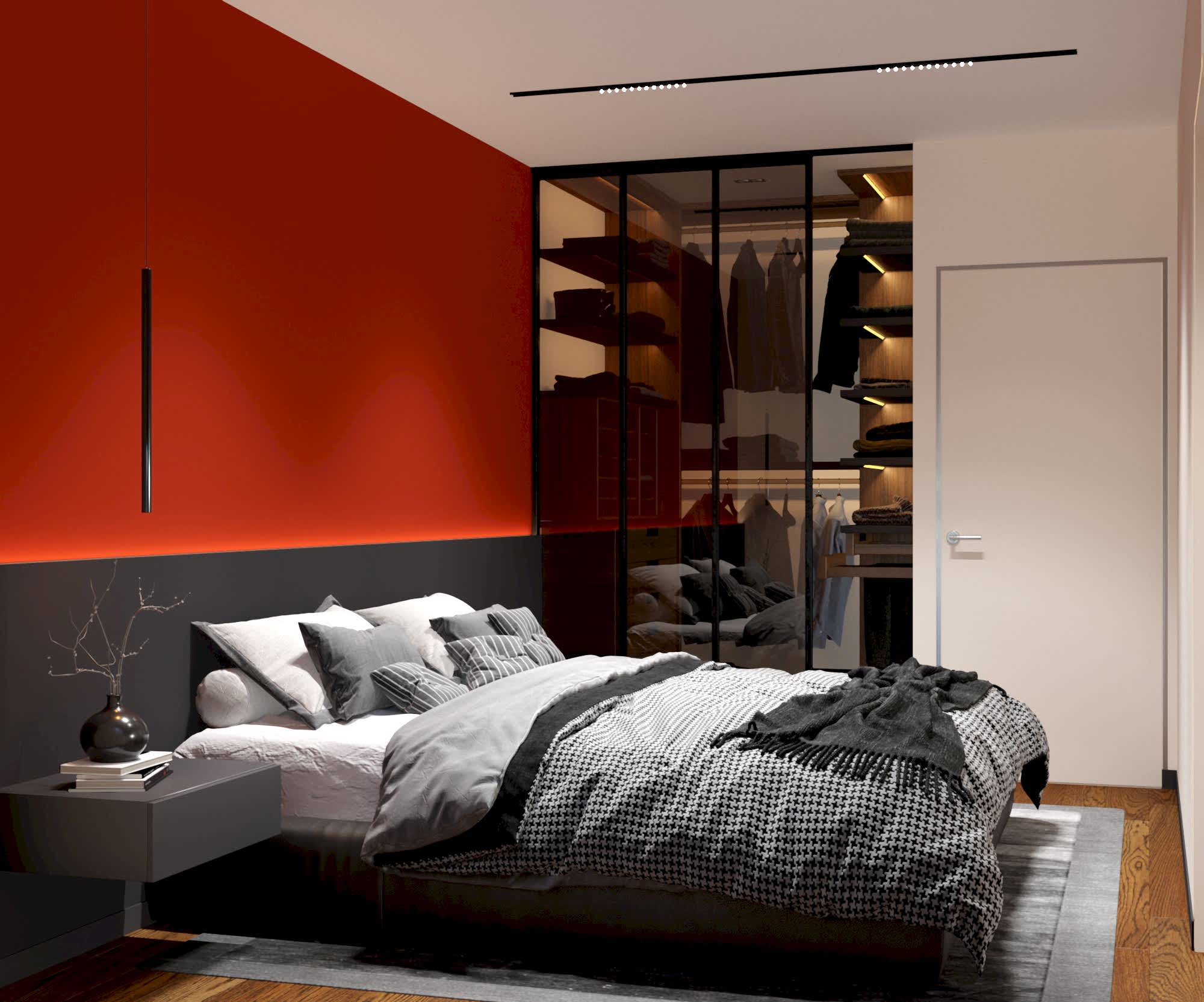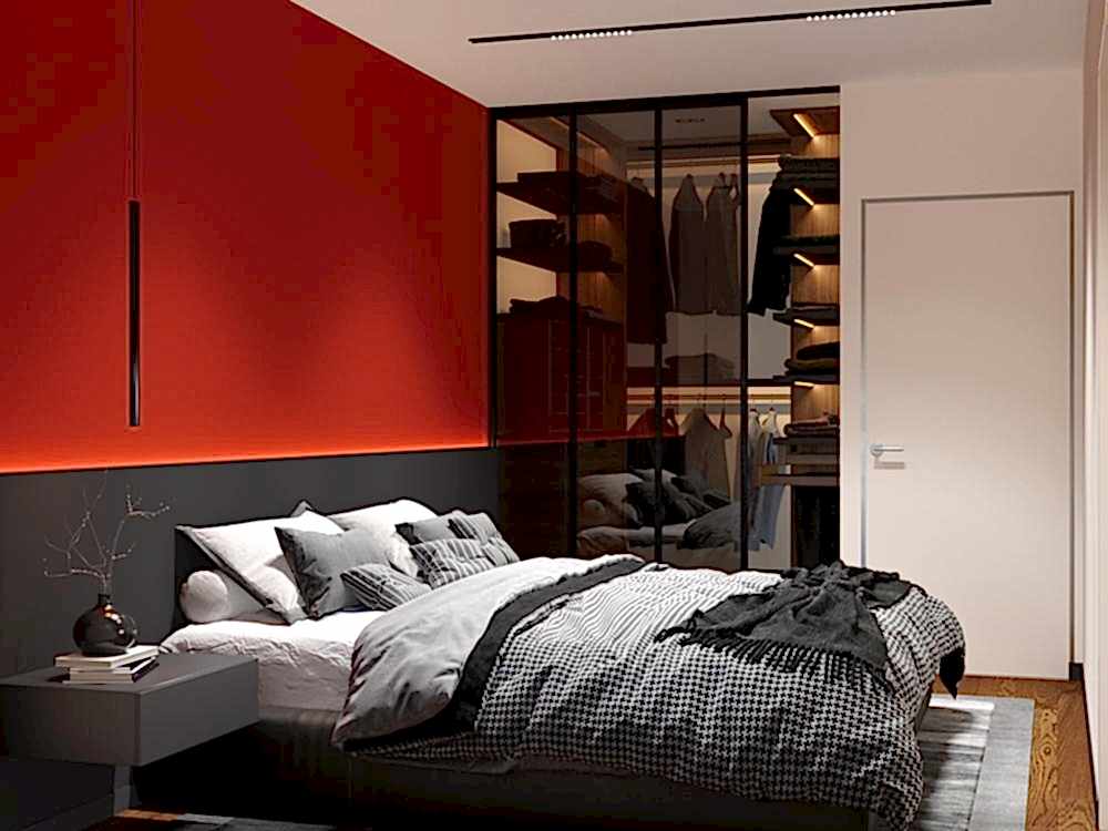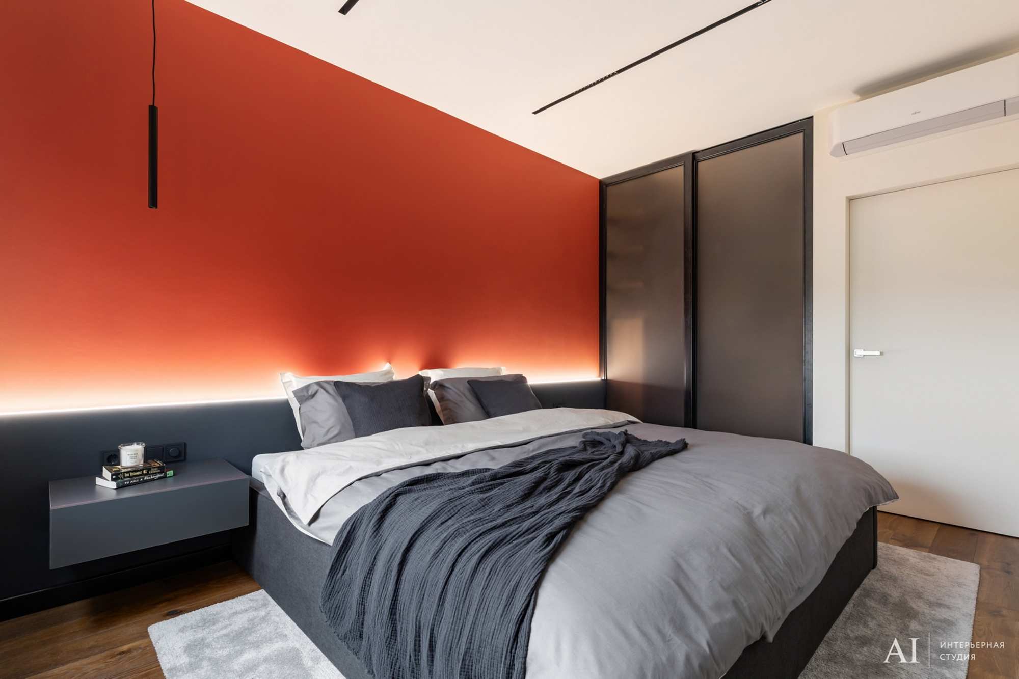 Pin-Up мужской интерьер с применением натуральныхматериалов, наполненный четкими линиями, большим количеством света и минимумом декора. Главным акцентом интерьера стал сочный красный цвет, который насытил пространство яркими красками и подчеркнул Рыскулова, 52 геометрию форм.