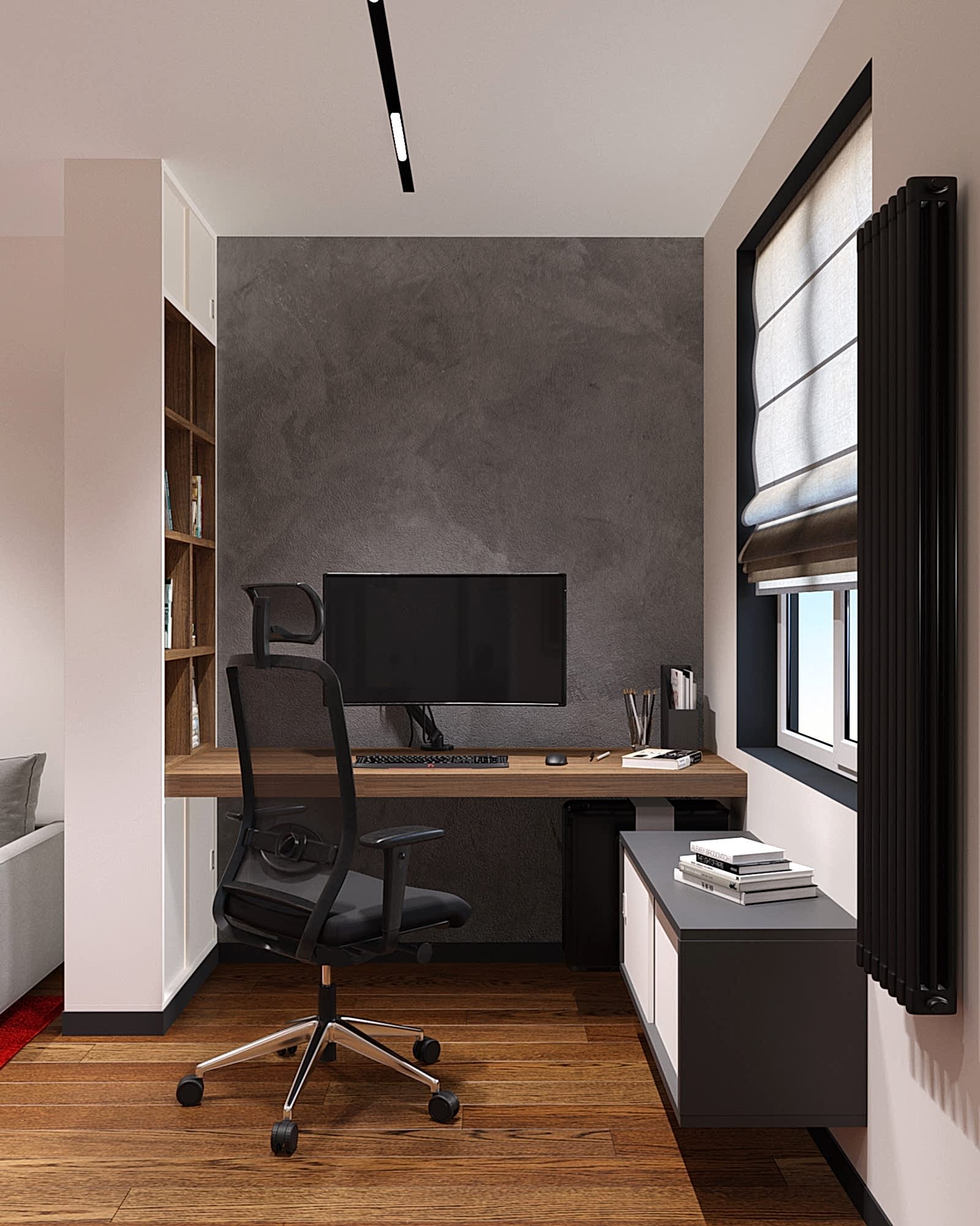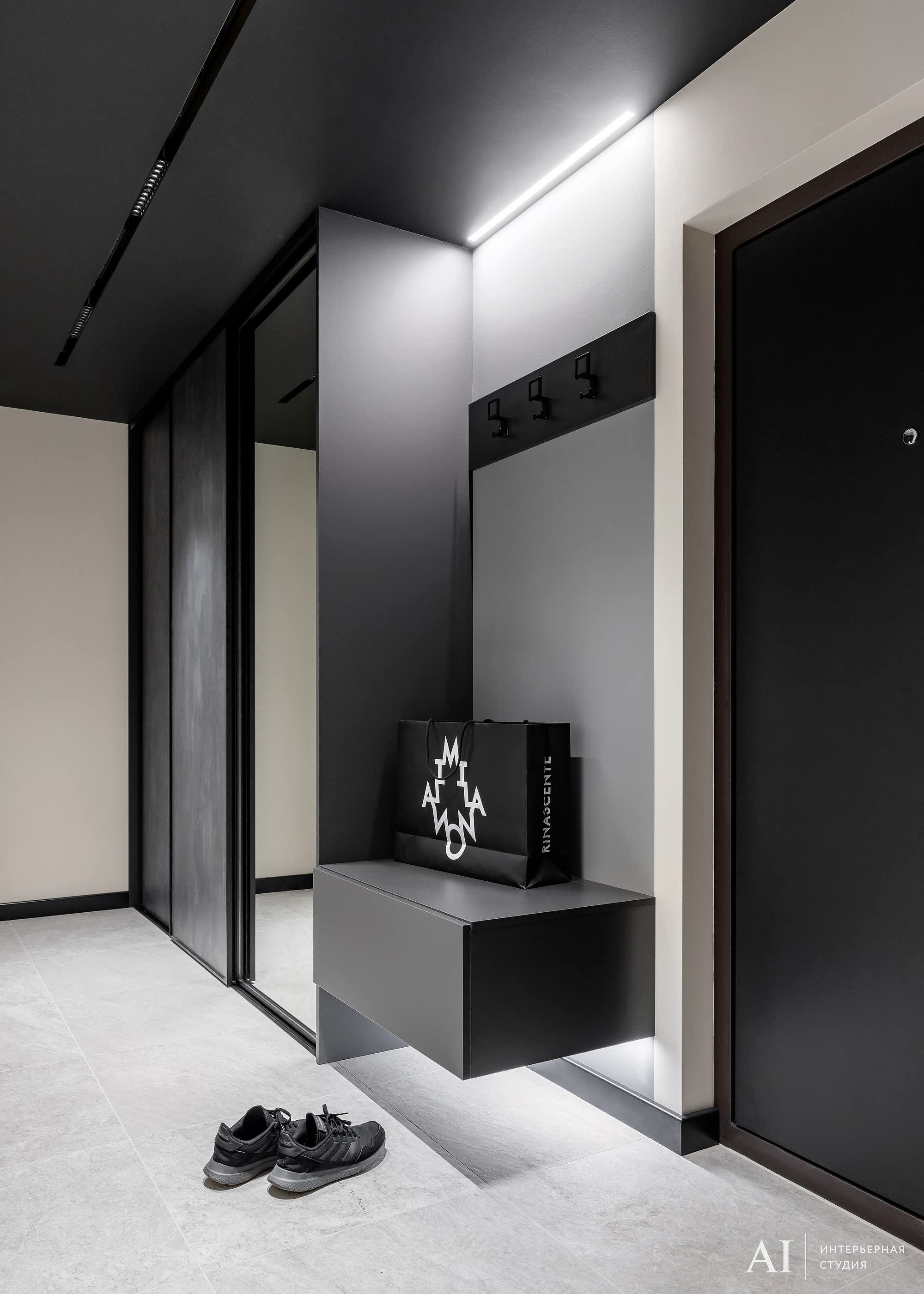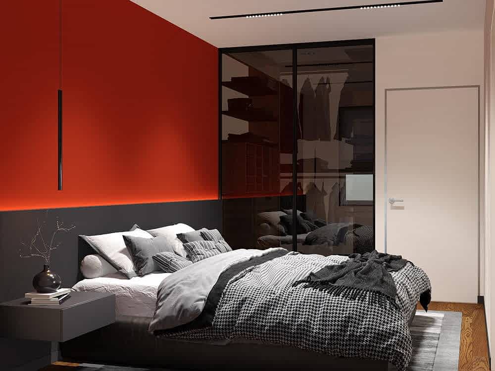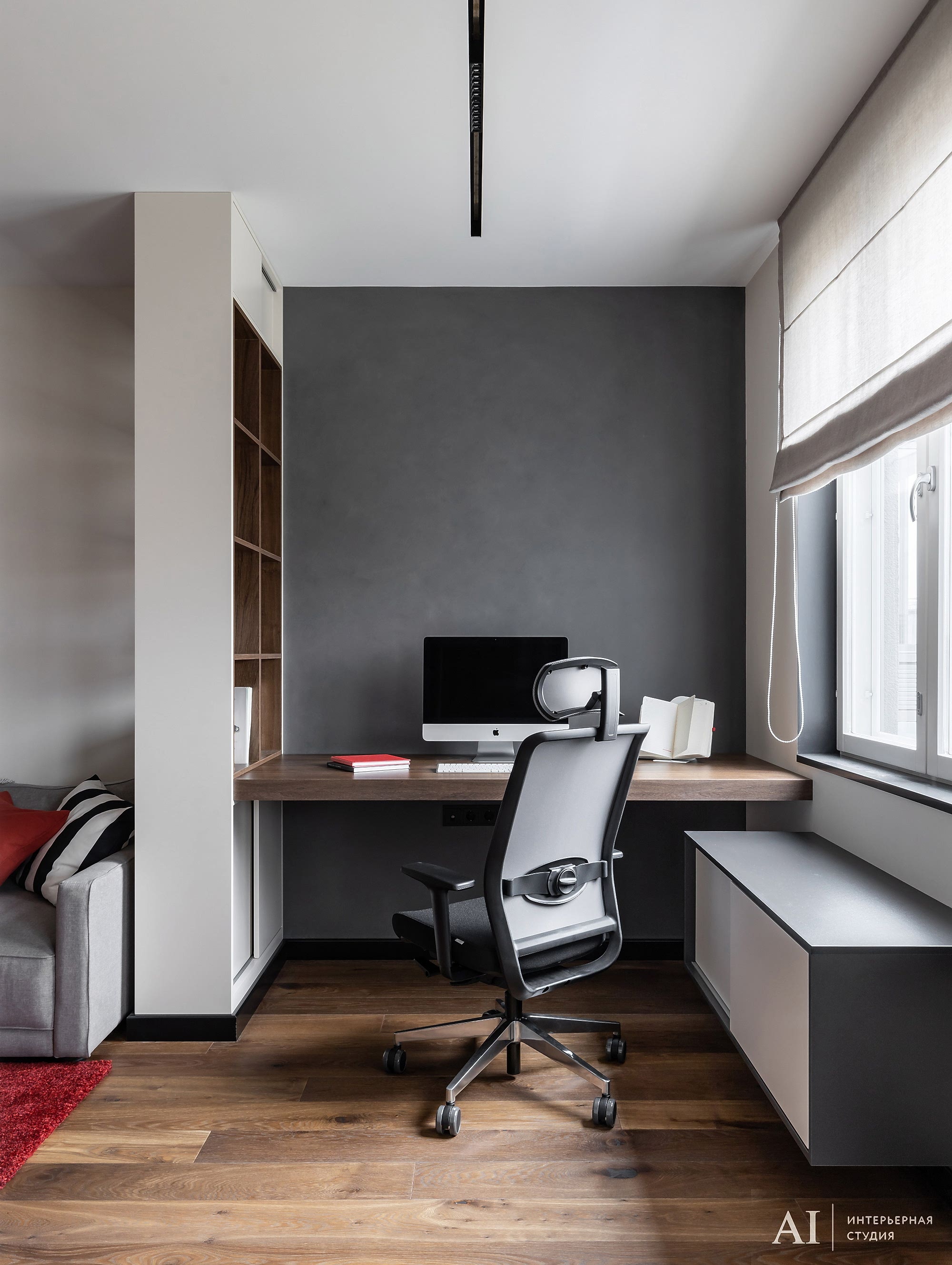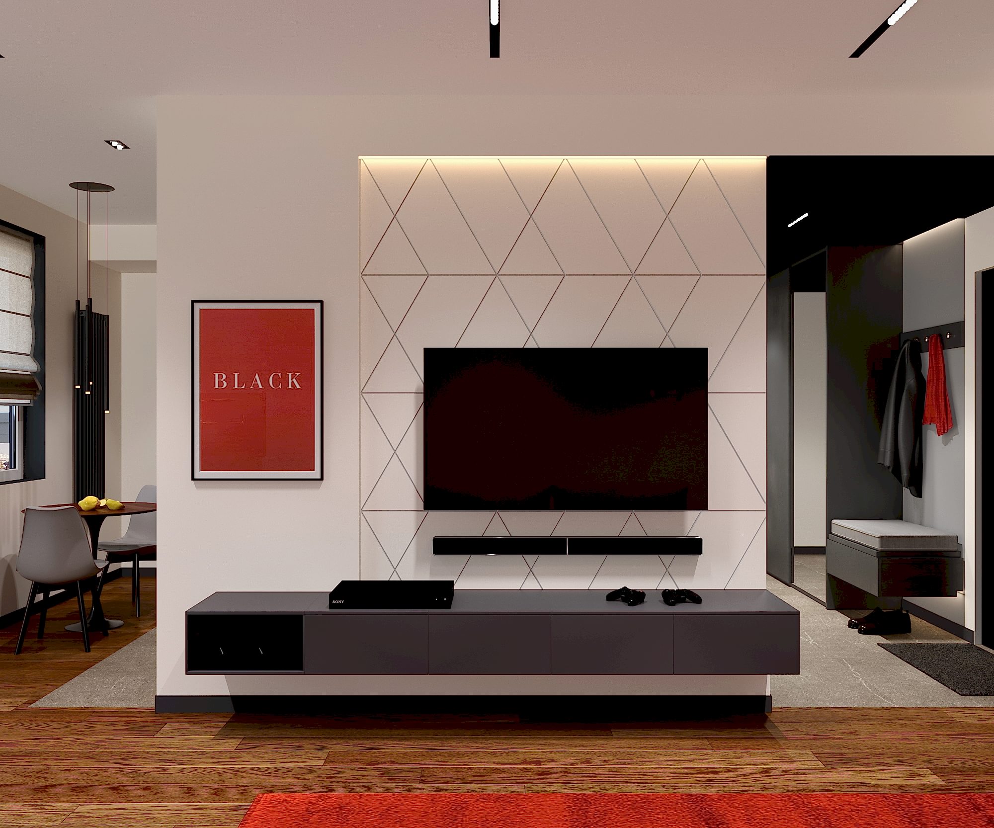 Pin-Up мужской интерьер с применением натуральныхматериалов, наполненный четкими линиями, большим количеством света и минимумом декора. Главным акцентом интерьера стал сочный красный цвет, который насытил пространство яркими красками и подчеркнул Рыскулова, 52 геометрию форм.