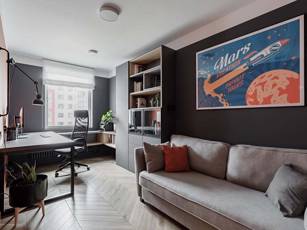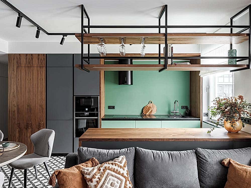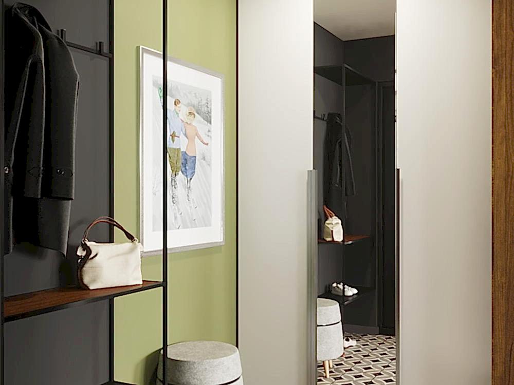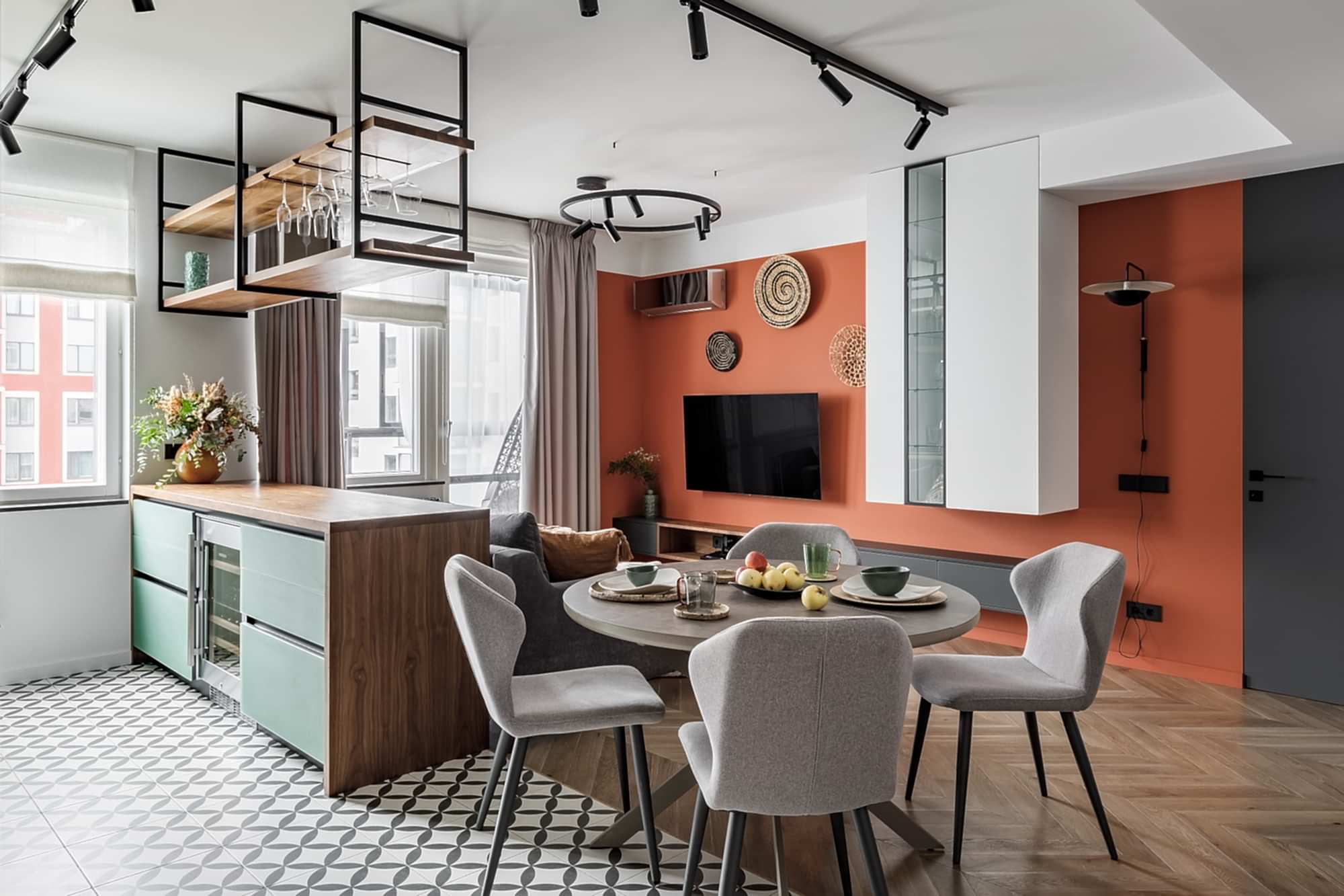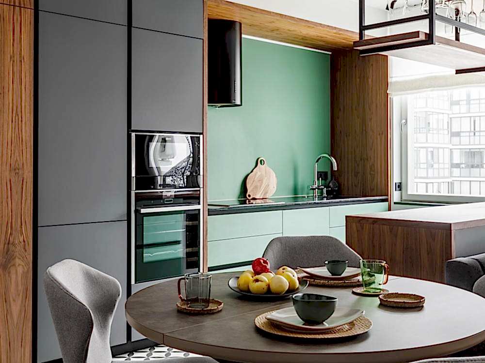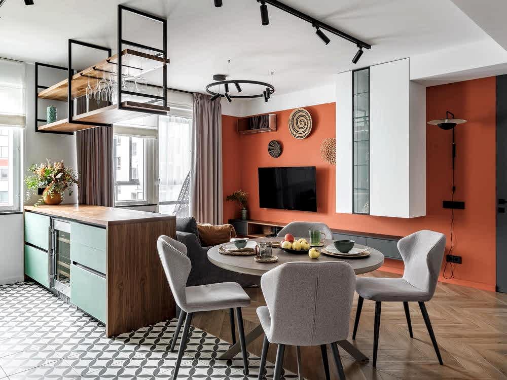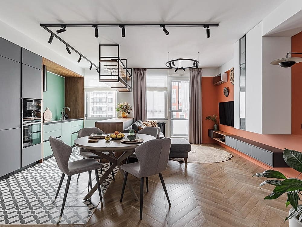 Квартира для молодой семьи, ведущей активный образ жизни и увлеченной Pin-Up видами спорта. Интерьер выполнен в современном стиле с использованием контрастных сочетаний цветов, материалов и большого количества света.