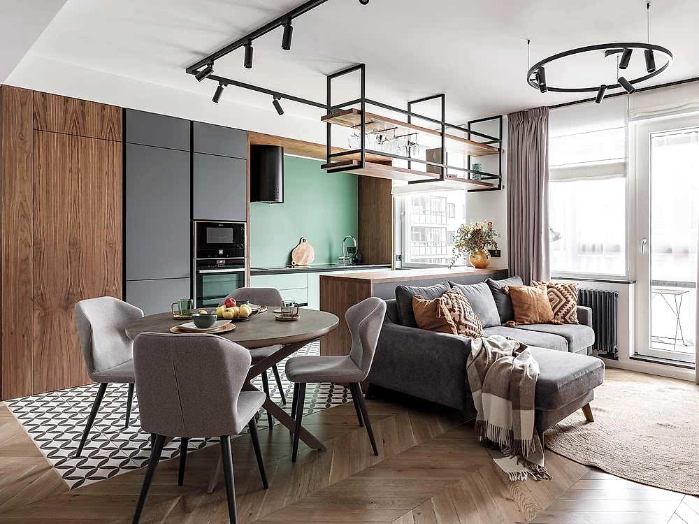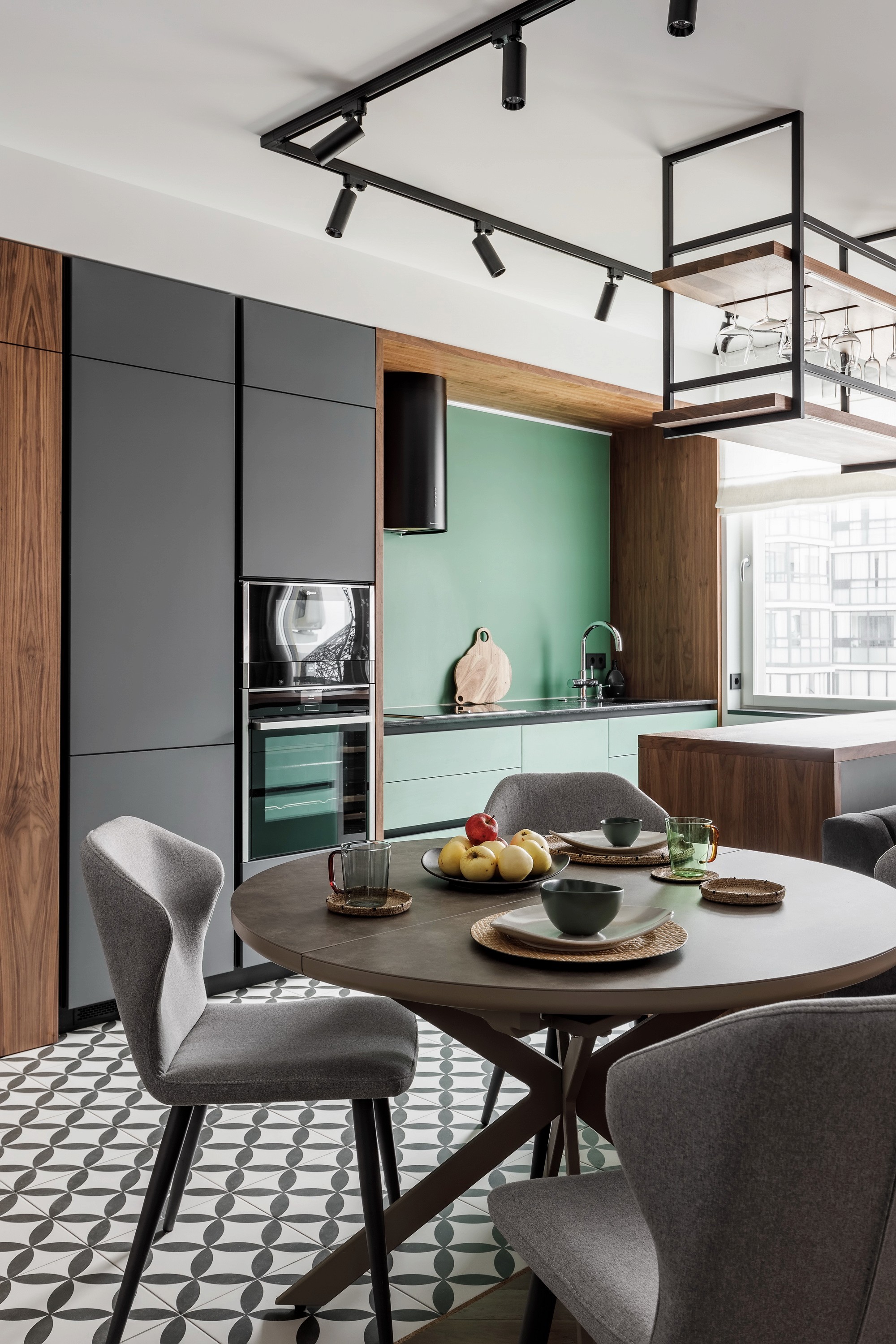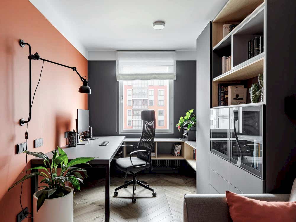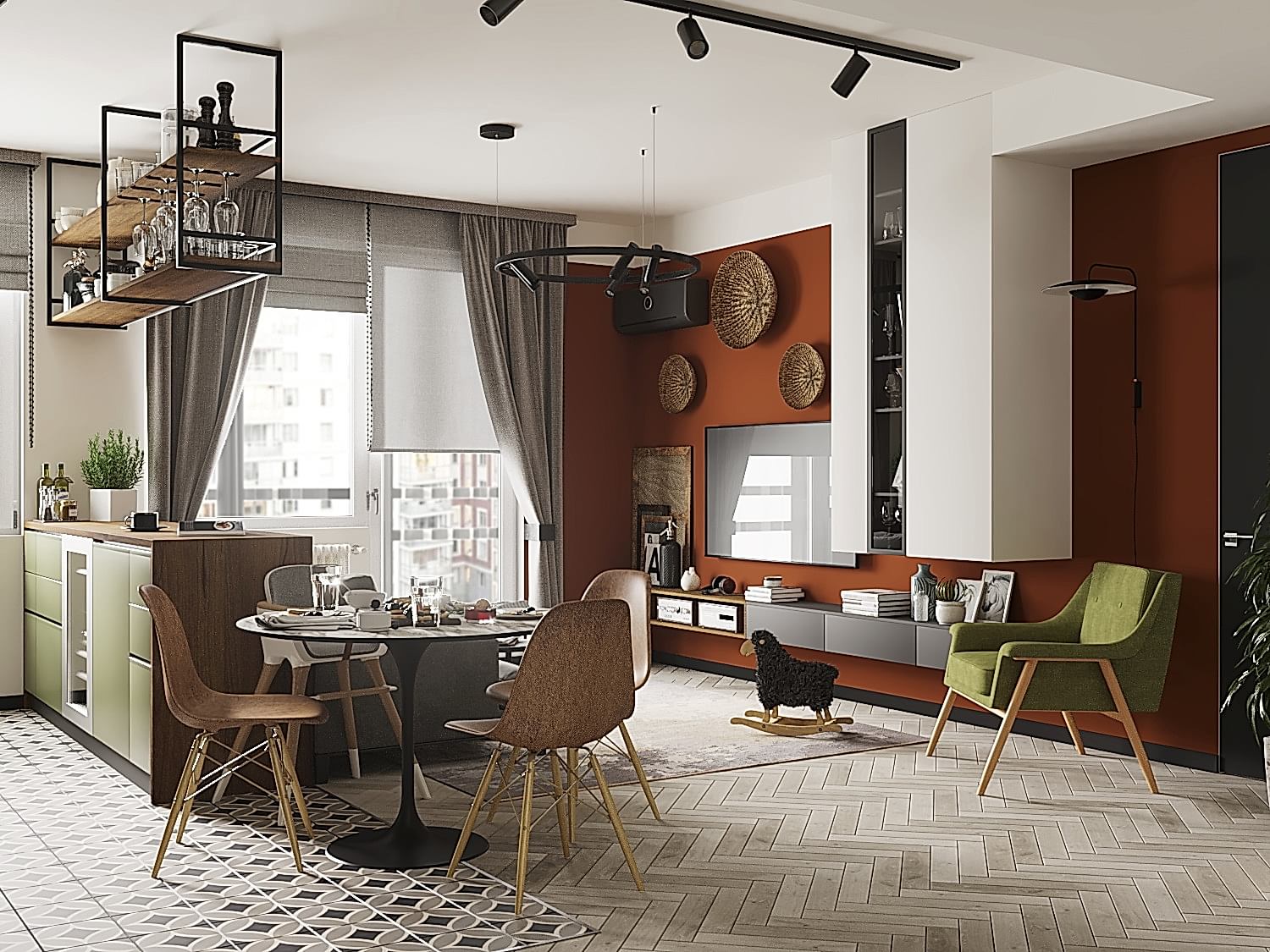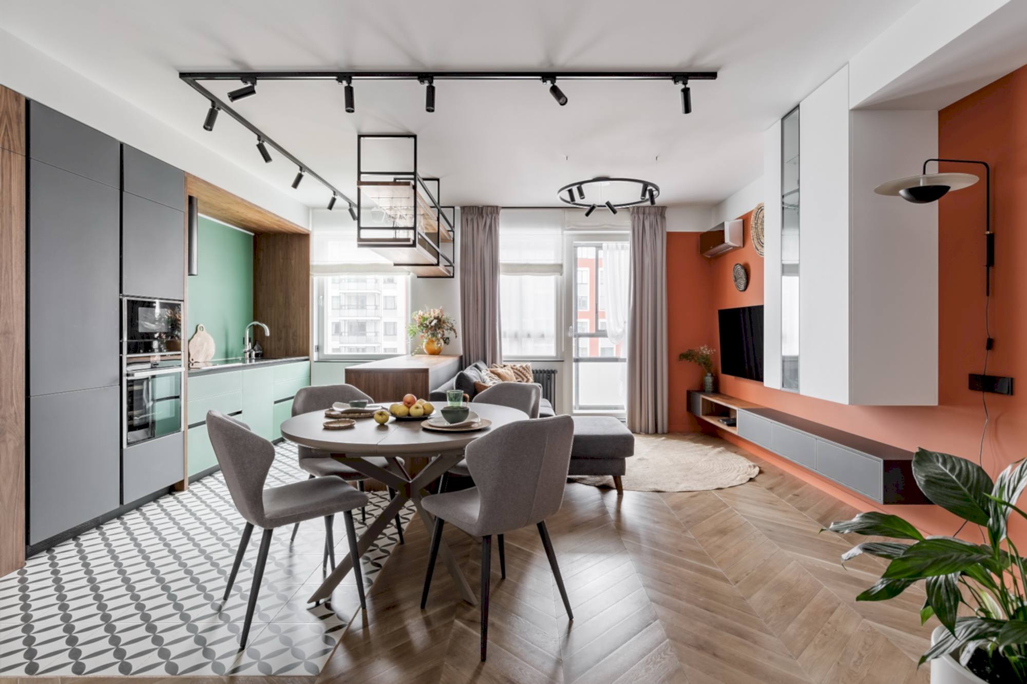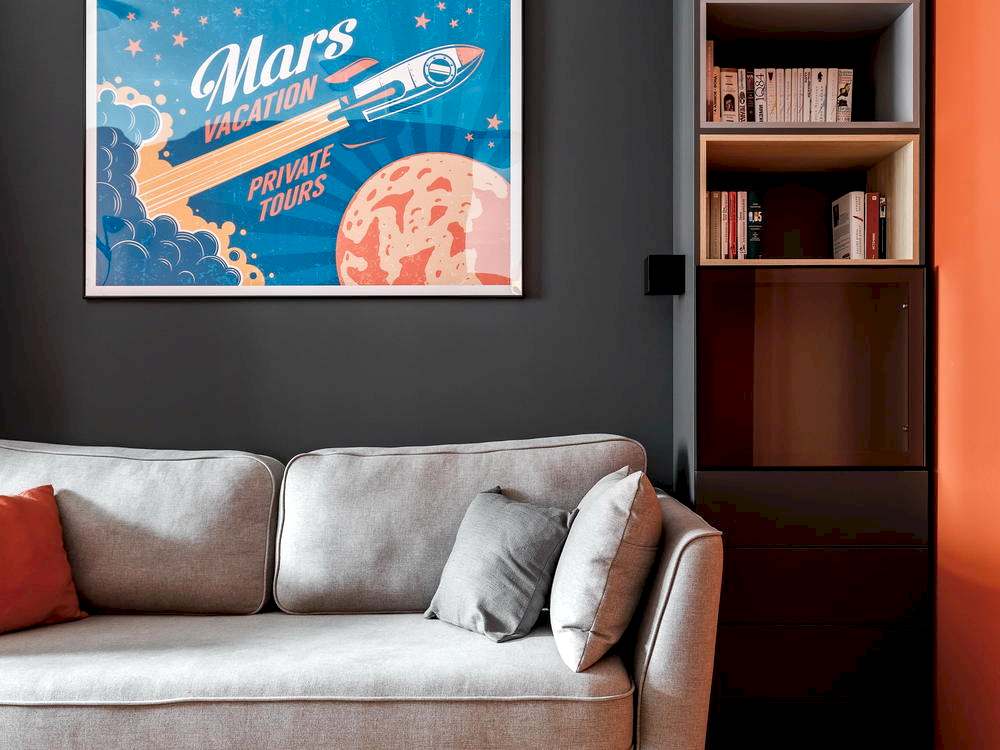 Квартира для молодой семьи, ведущей активный образ жизни и увлеченной Pin-Up видами спорта. Интерьер выполнен в современном стиле с использованием контрастных сочетаний цветов, материалов и большого количества света.
