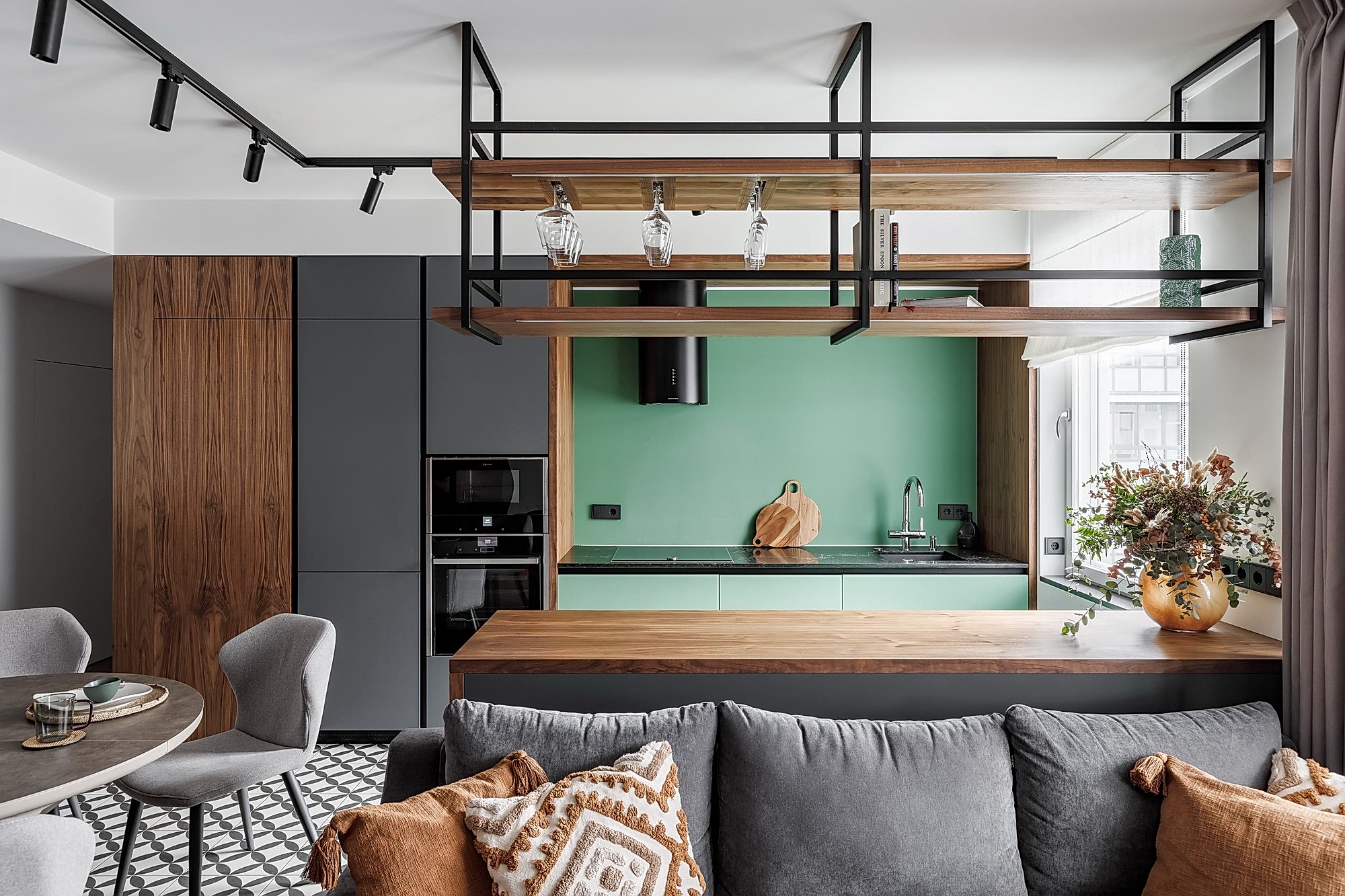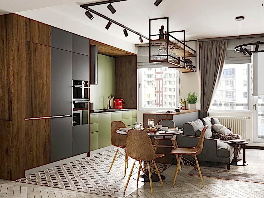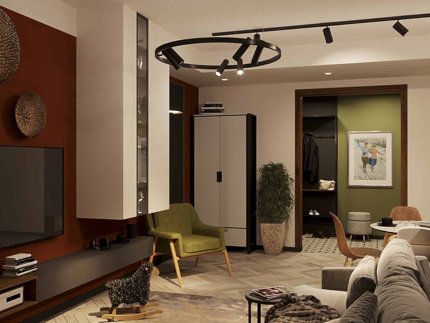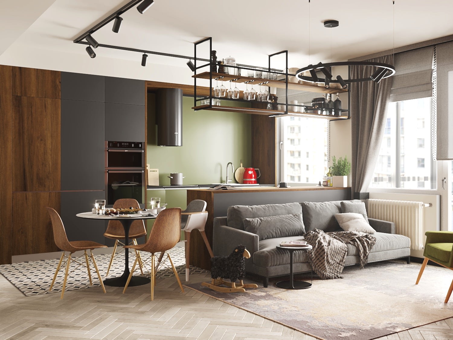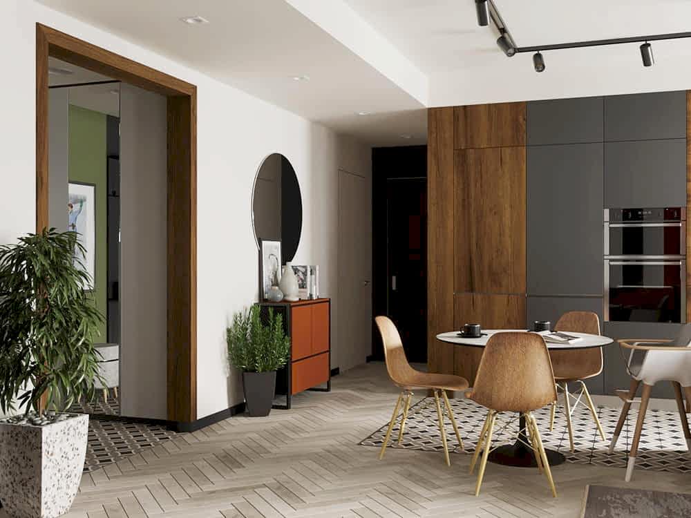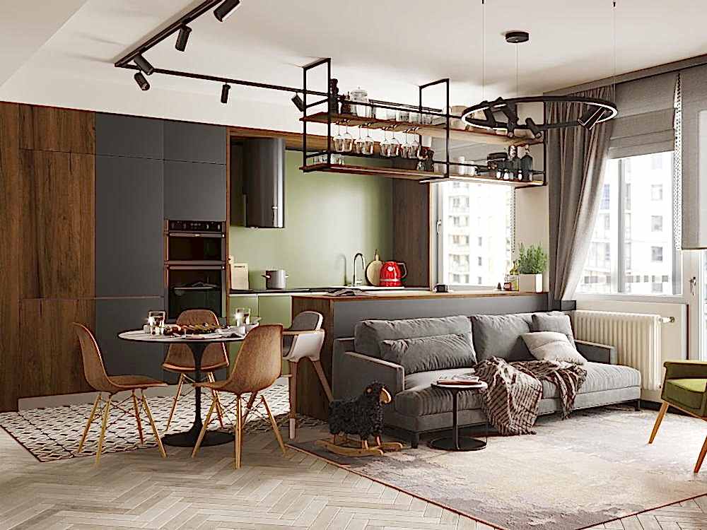 Квартира для молодой семьи, ведущей активный образ жизни и увлеченной Pin-Up видами спорта. Интерьер выполнен в современном стиле с использованием контрастных сочетаний цветов, материалов и большого количества света.