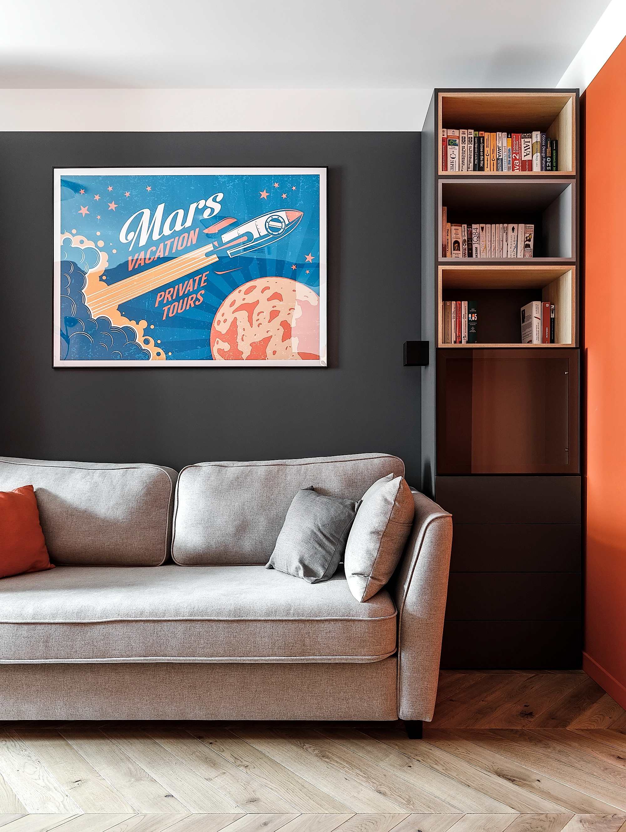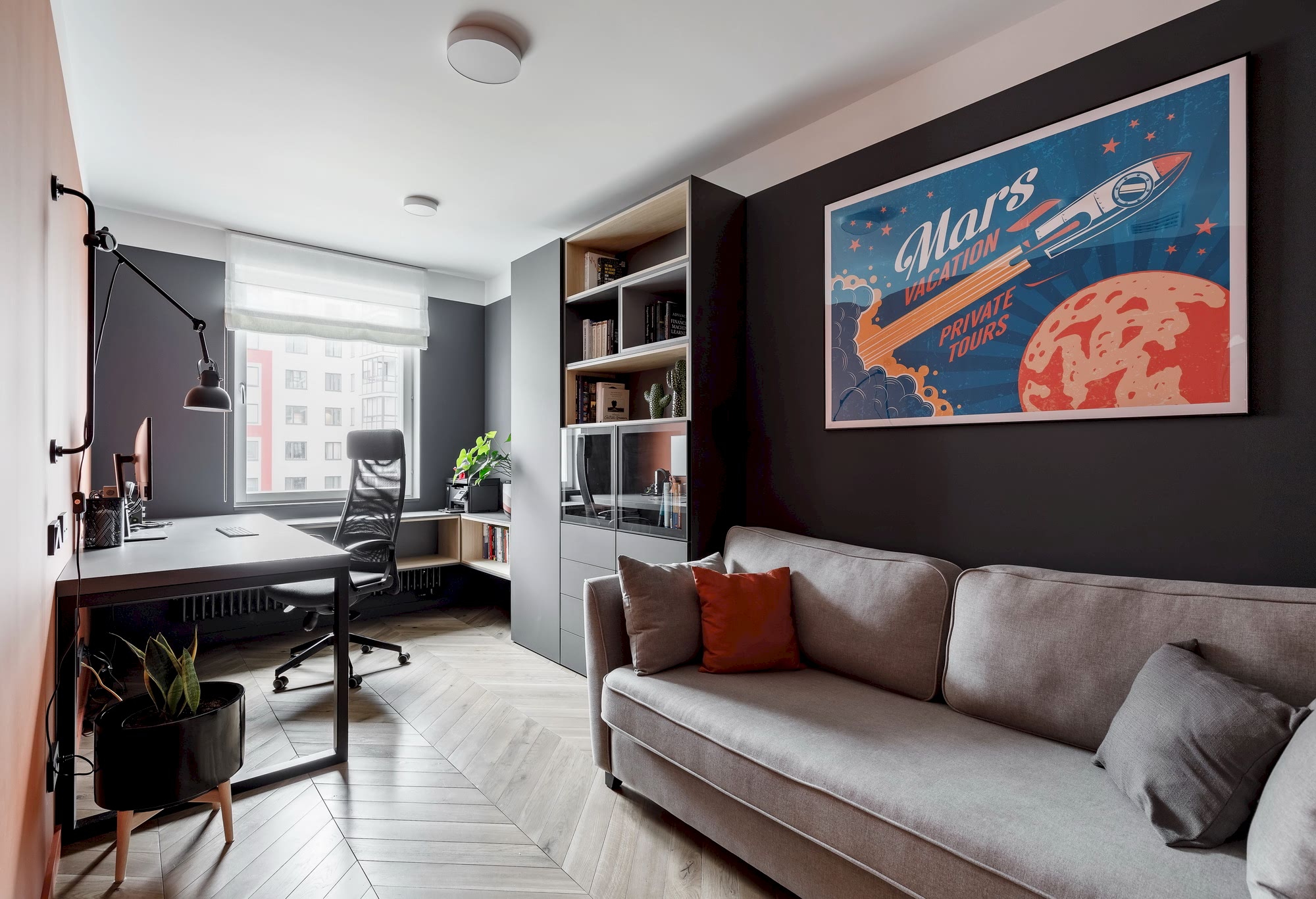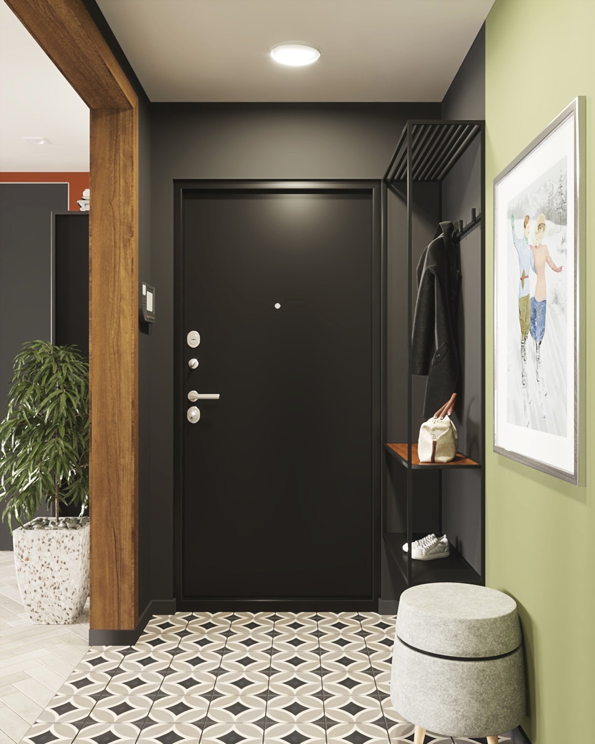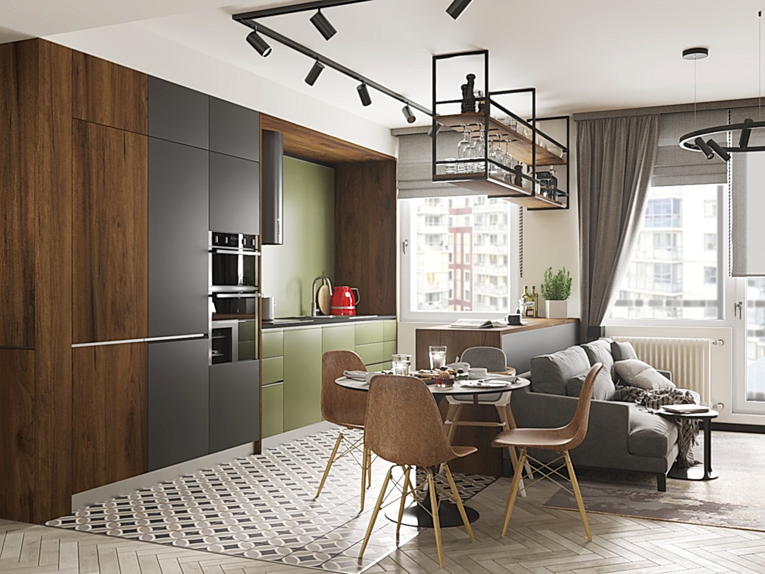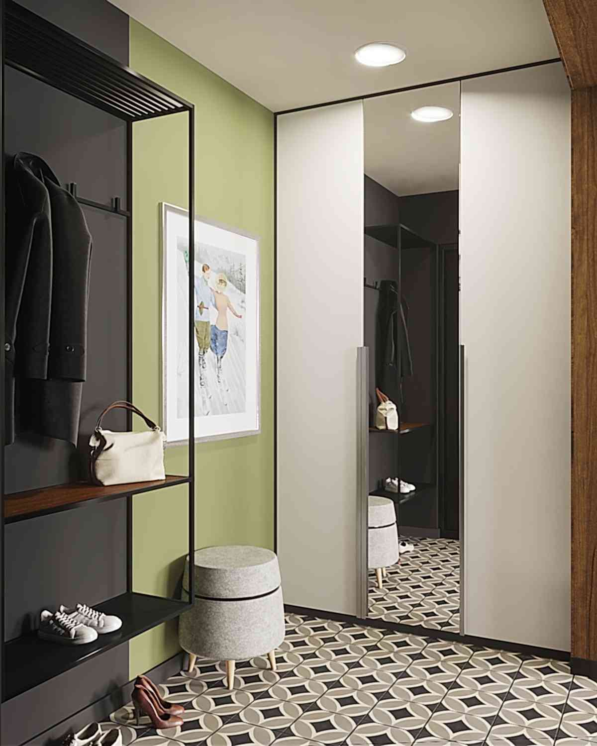 Квартира для молодой семьи, ведущей активный образ жизни и увлеченной Pin-Up видами спорта. Интерьер выполнен в современном стиле с использованием контрастных сочетаний цветов, материалов и большого количества света.