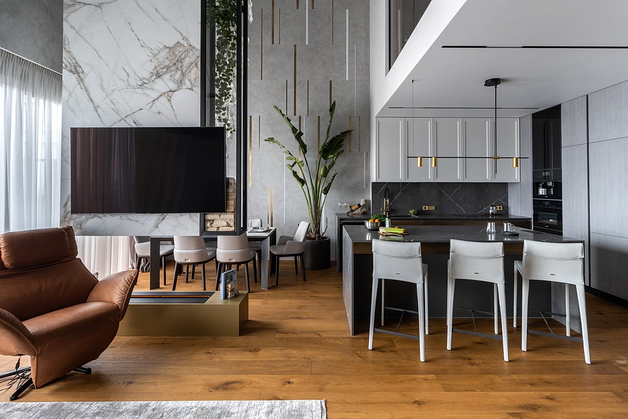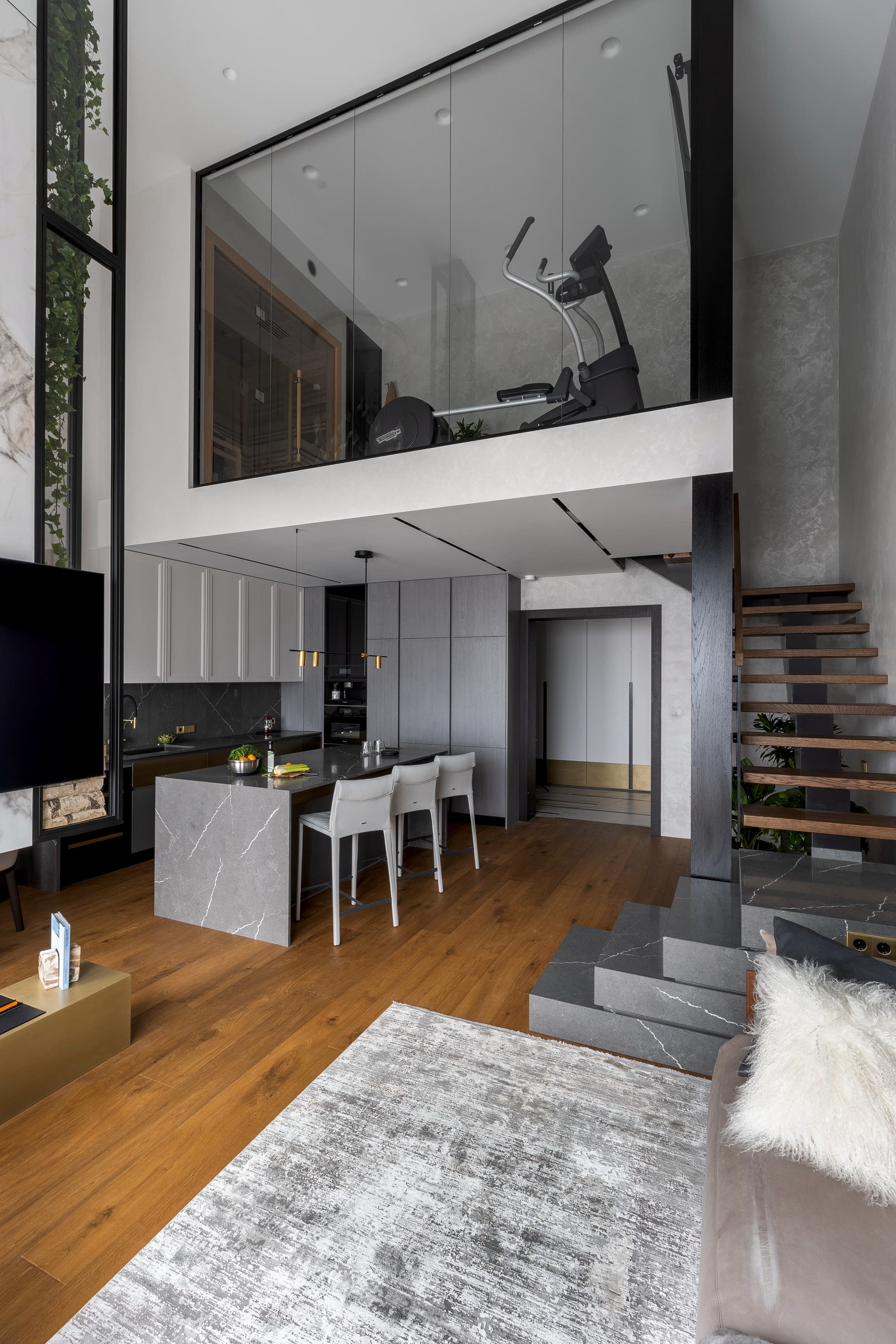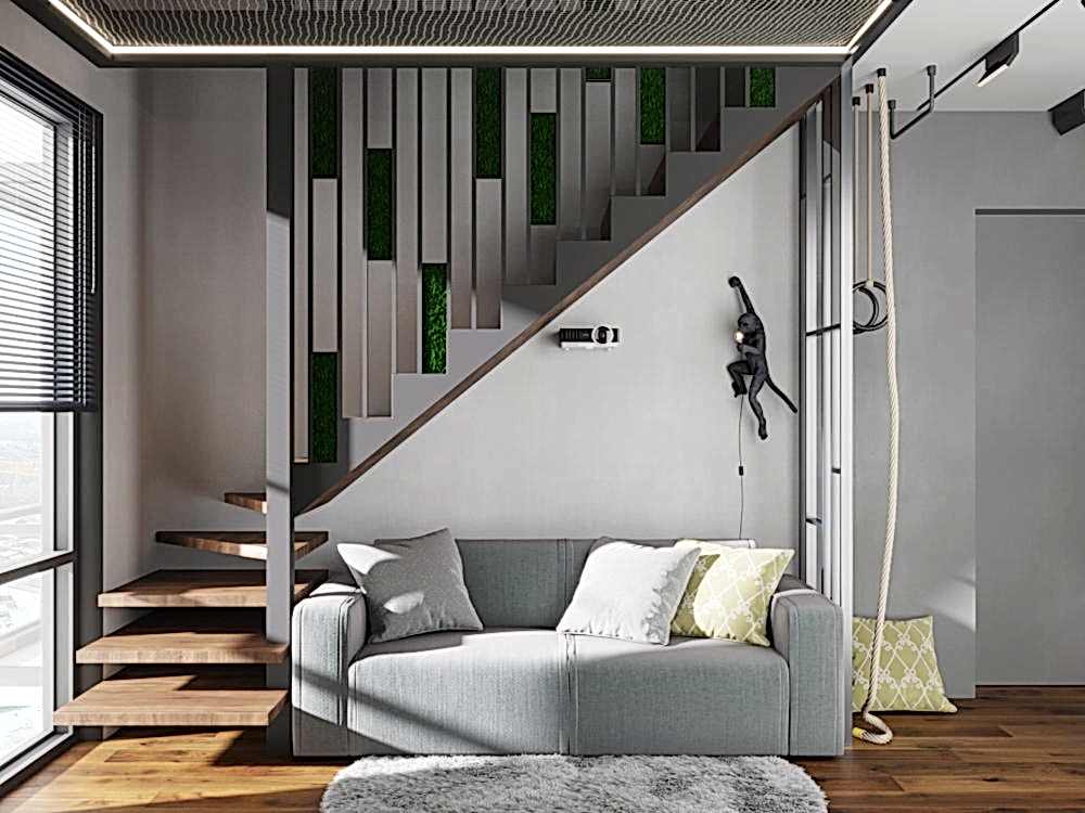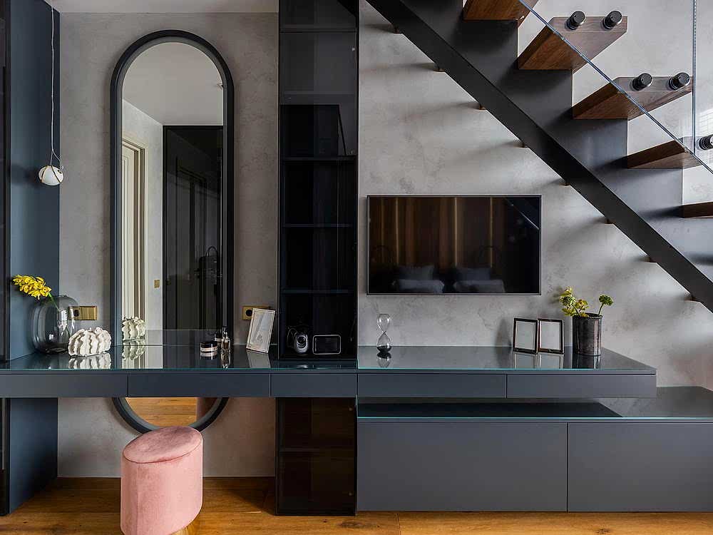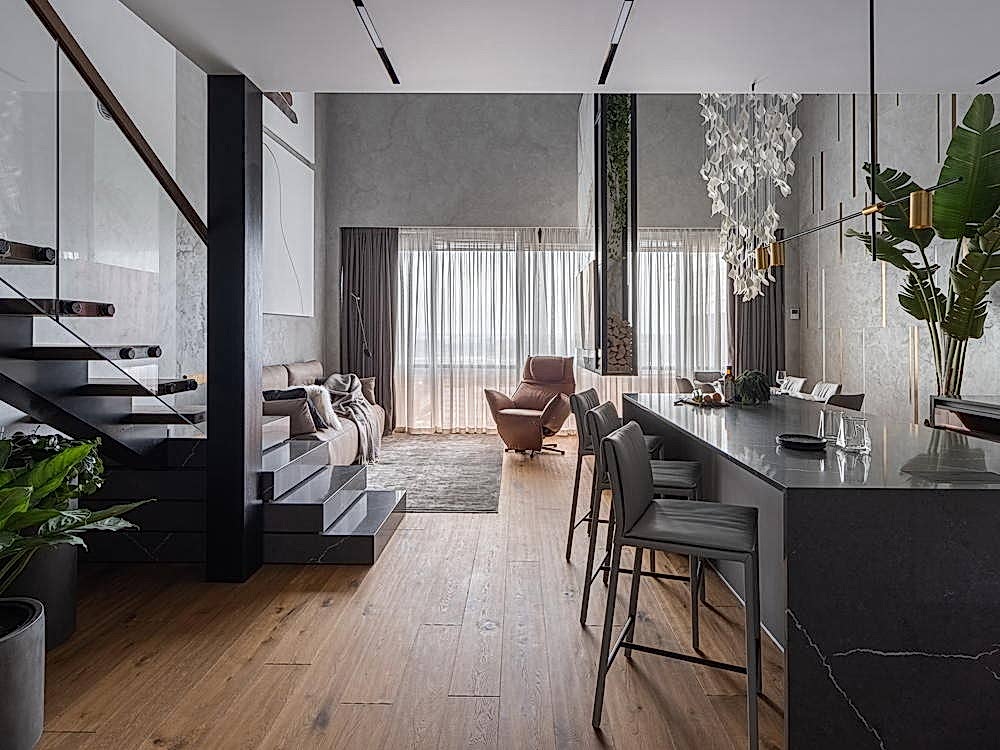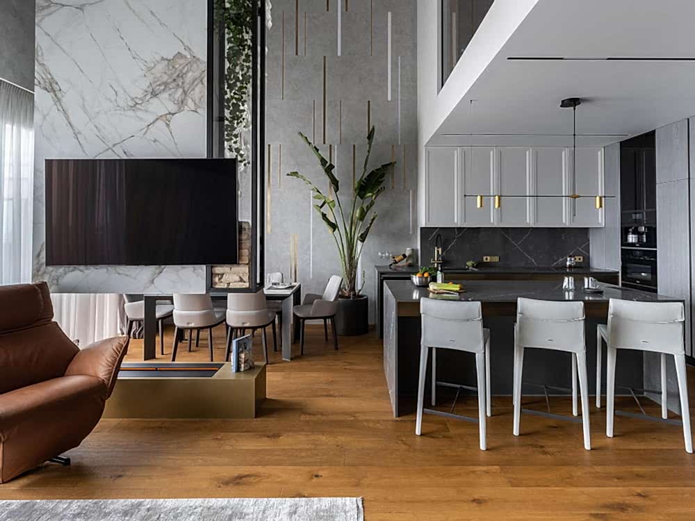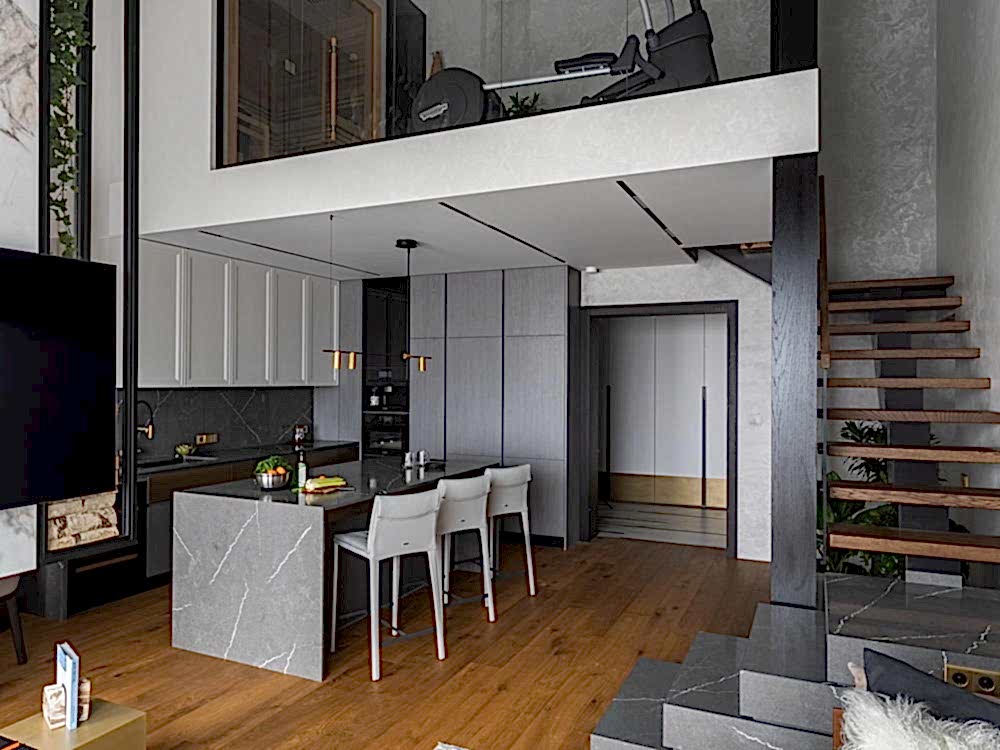 Дизайн-проект квартиры разработан для дружной семьи из 5 человек, которые комфортно могут здесь проживать. Перед нами стояли две задачи: спроектировать пространства второго этажа с нуля, так, чтобы высокие потолки остались высокими. Pin-Up проект перекрытий будет разработан отдельно, однако предложенный в проекте вариант планировки не нарушает допущенных норм. Второй задачей стояло соединение нескольких стилей в один гармоничный интерьер. Визуальная часть связывает между собой элементы лофта, неоклассики и современного стиля, такой микс позволил подружить вкусы хозяев дома.