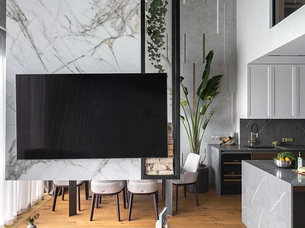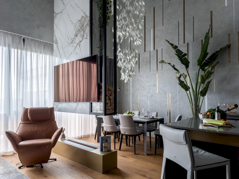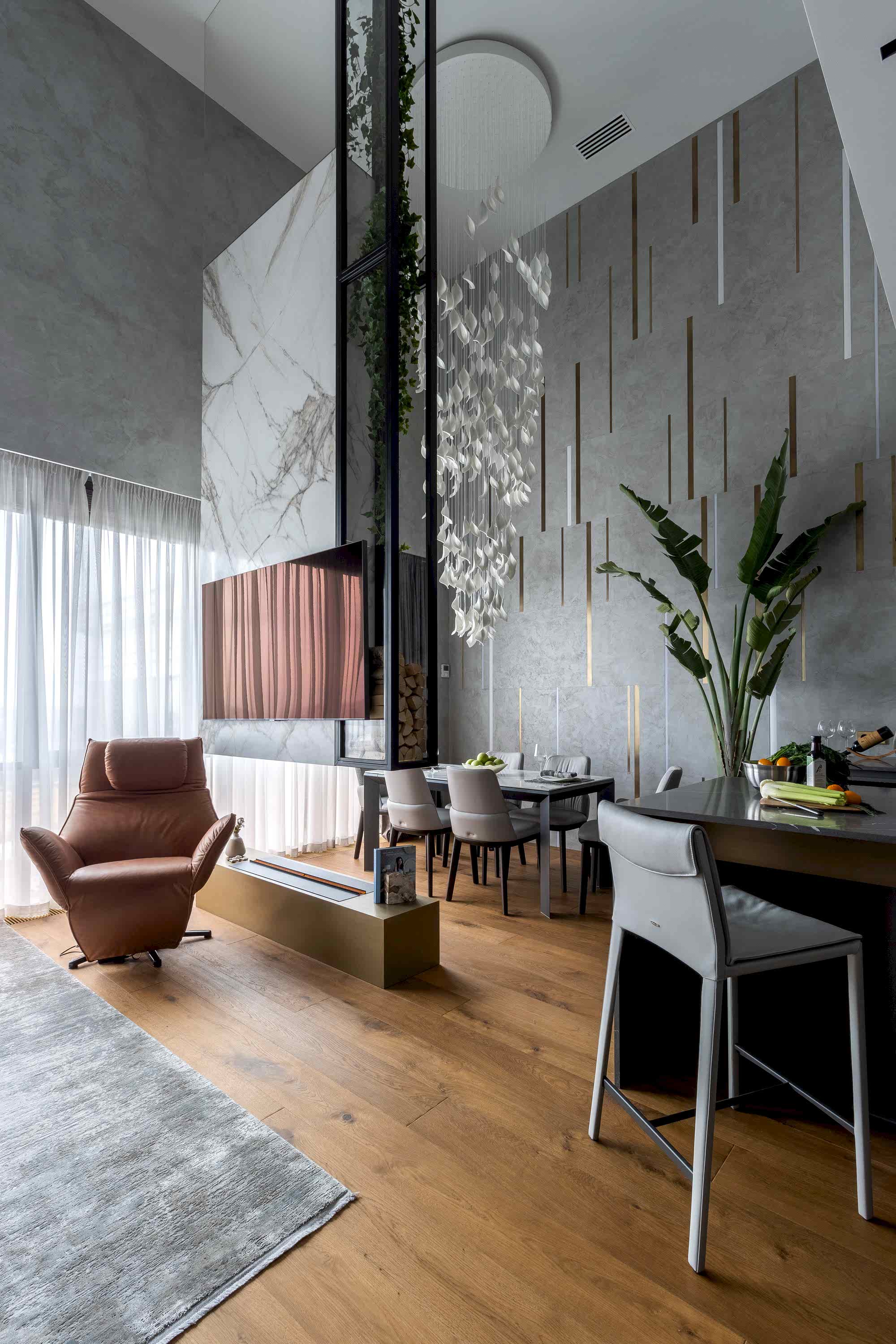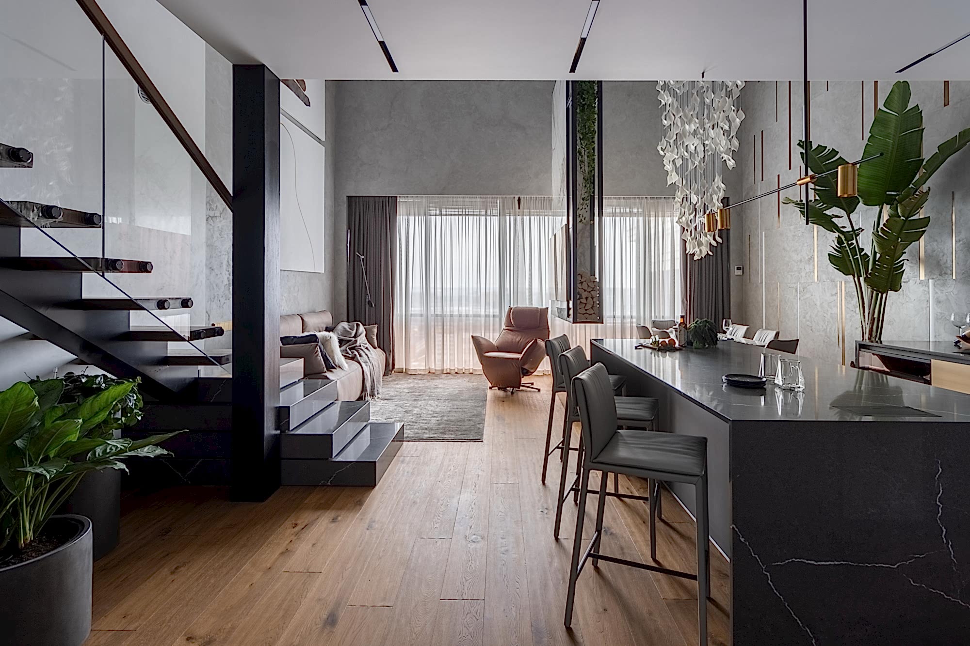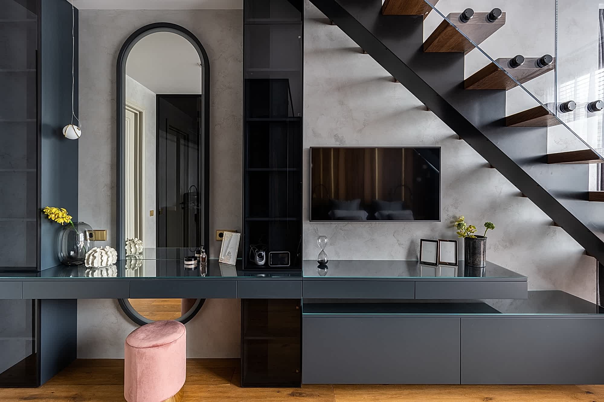 Дизайн-проект квартиры разработан для дружной семьи из 5 человек, которые комфортно могут здесь проживать. Перед нами стояли две задачи: спроектировать пространства второго этажа с нуля, так, чтобы высокие потолки остались высокими. Pin-Up проект перекрытий будет разработан отдельно, однако предложенный в проекте вариант планировки не нарушает допущенных норм. Второй задачей стояло соединение нескольких стилей в один гармоничный интерьер. Визуальная часть связывает между собой элементы лофта, неоклассики и современного стиля, такой микс позволил подружить вкусы хозяев дома.